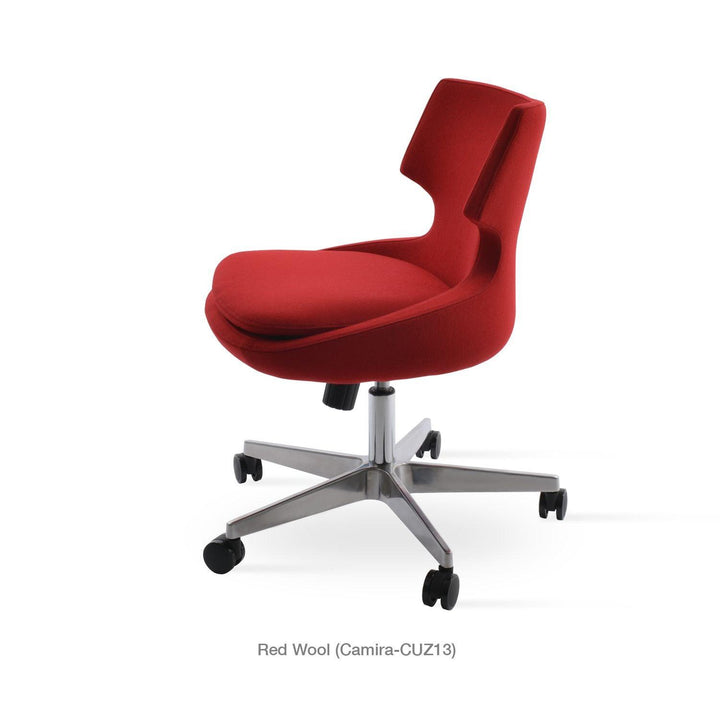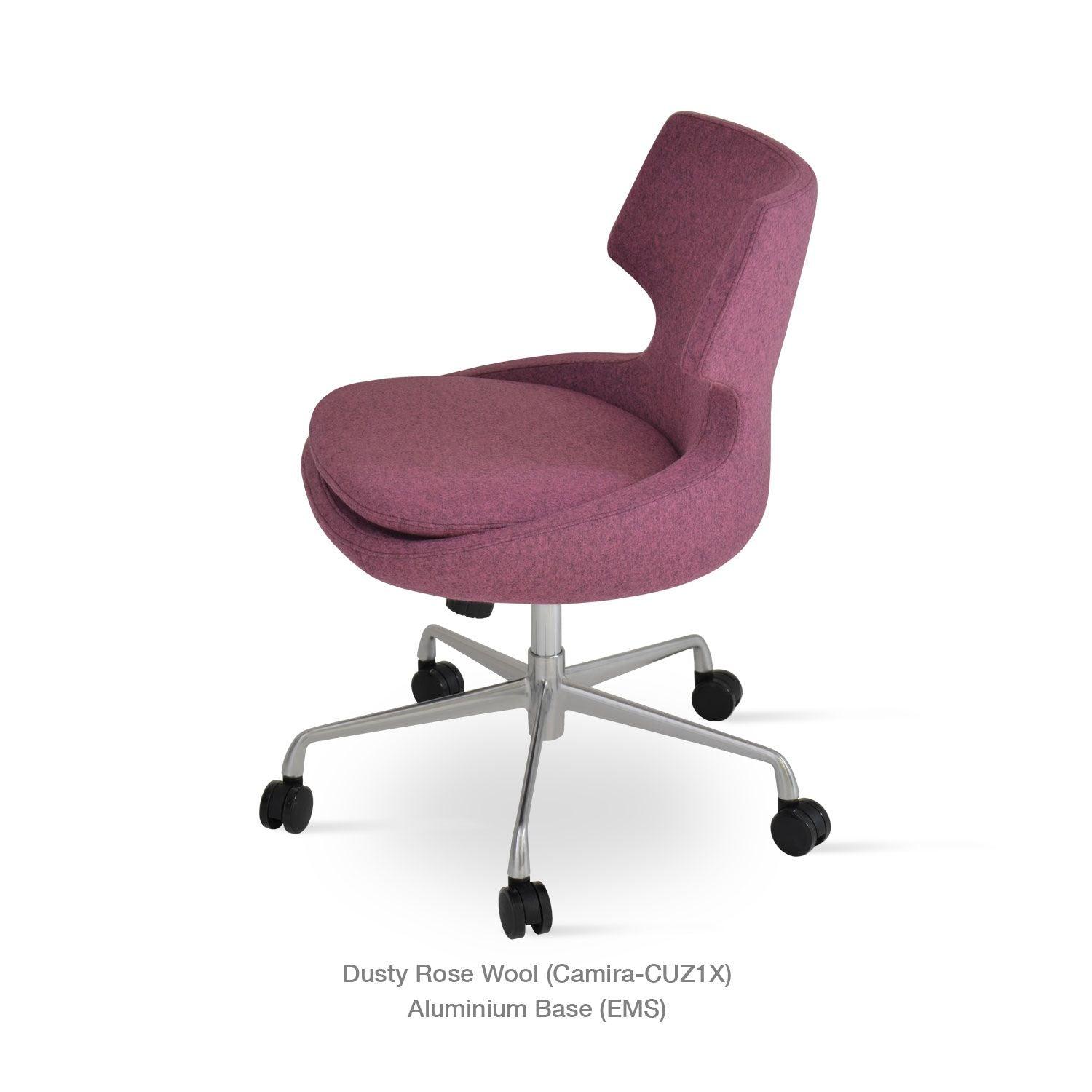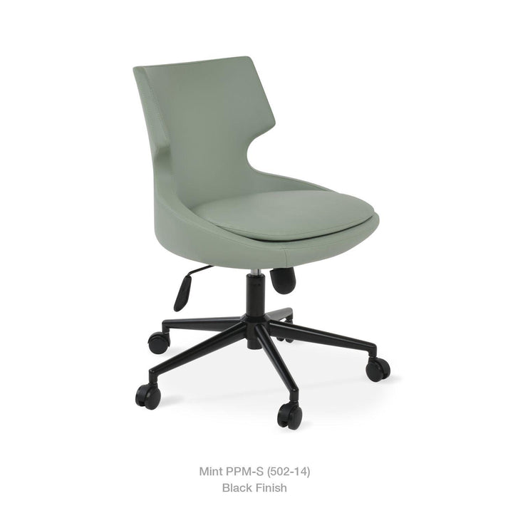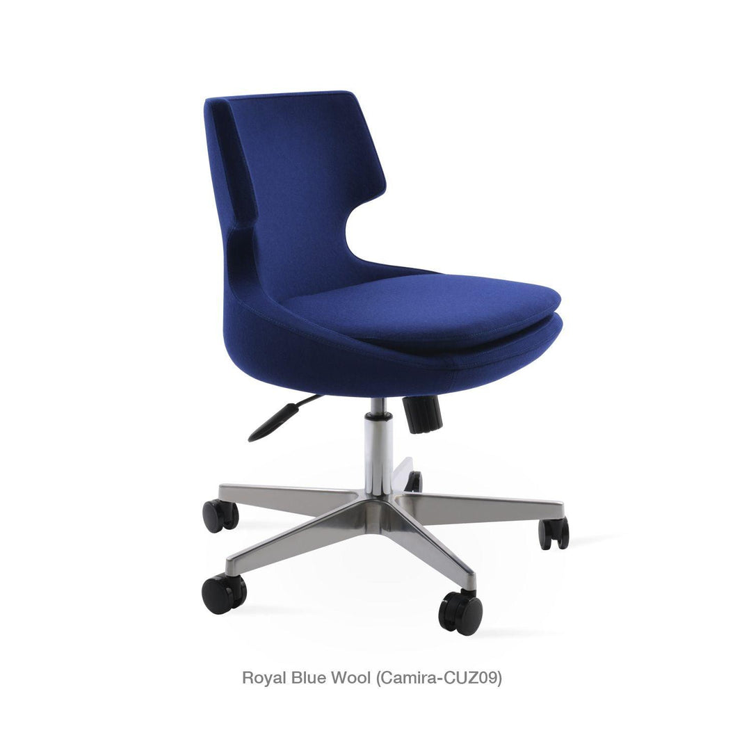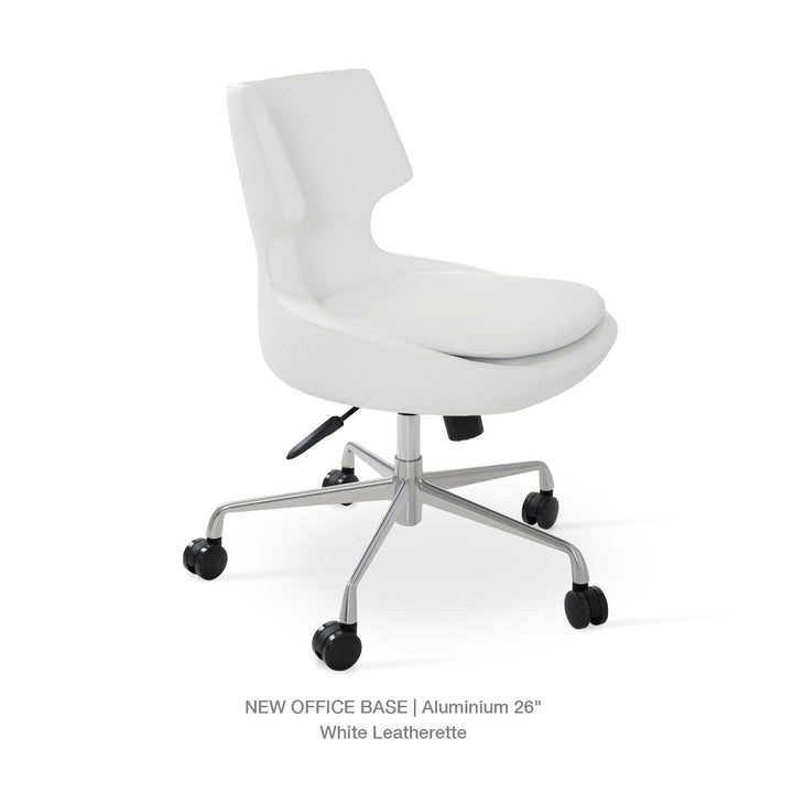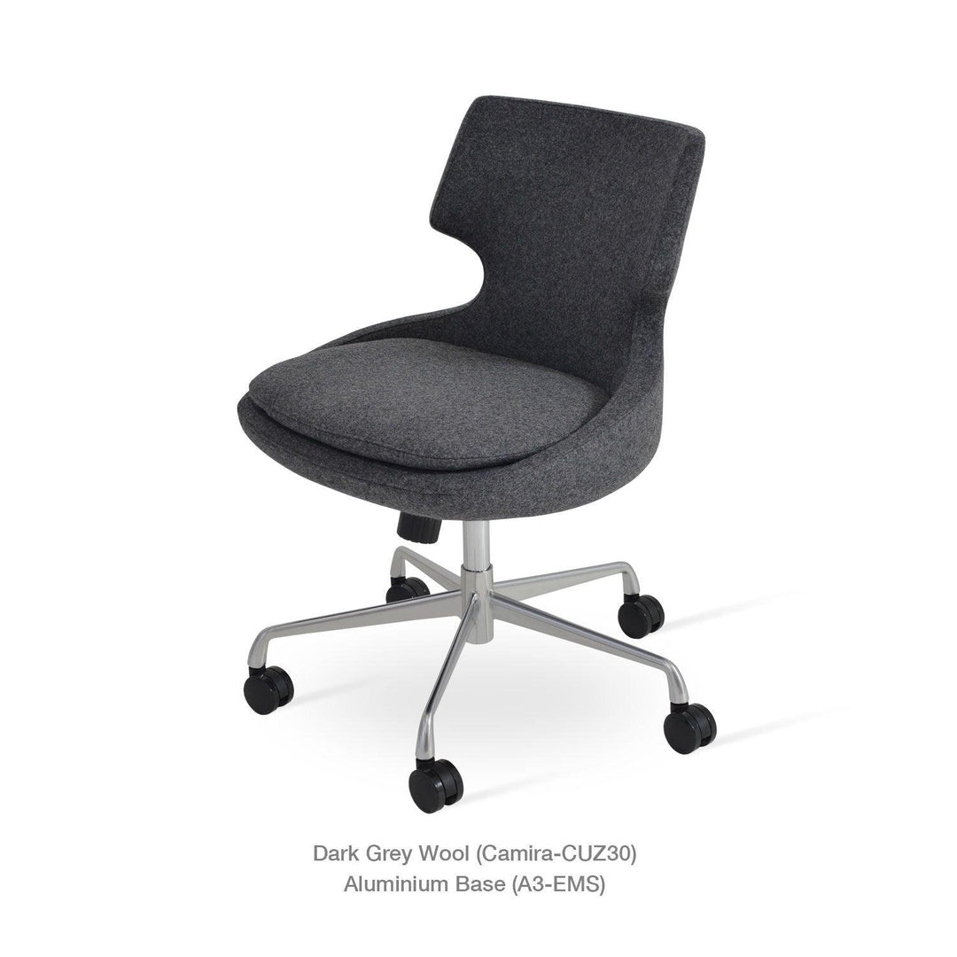 The Patara office is a distinctive chair with a comfortable upholstered seat and backrest on a height-adjustable gas piston base that swivels and tilts. The chair has a chromed steel five-star base with plastic casters. The seat has a steel structure with “S” shape springs for extra flexibility and strength. This steel frame is molded by injecting polyurethane foam. Patara seat is upholstered with removable zipper-enclosed leather, leatherette, or wool fabric slipcover. The chair is suitable for both residential and commercial use.