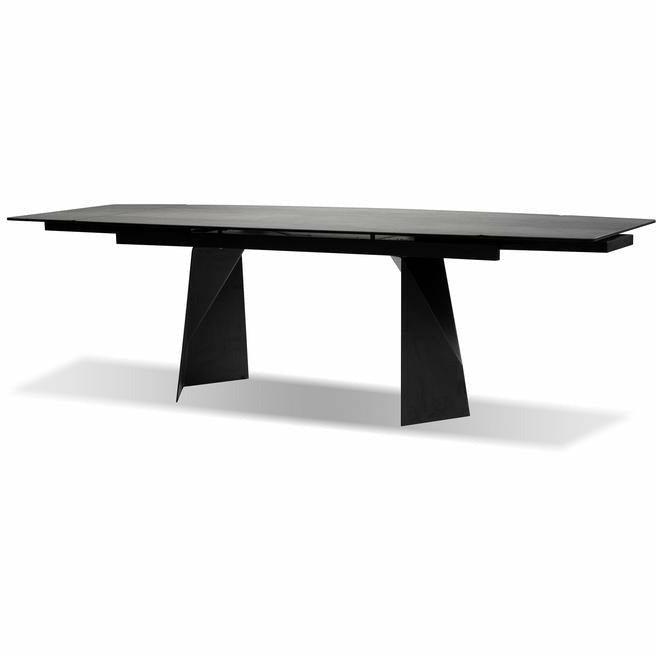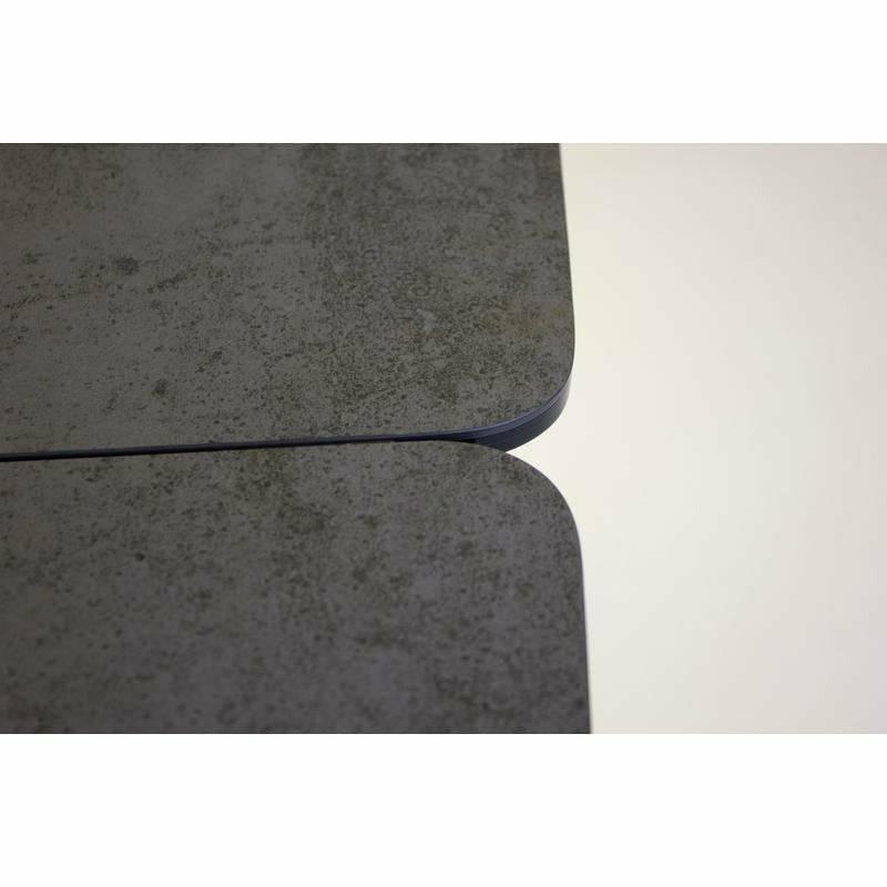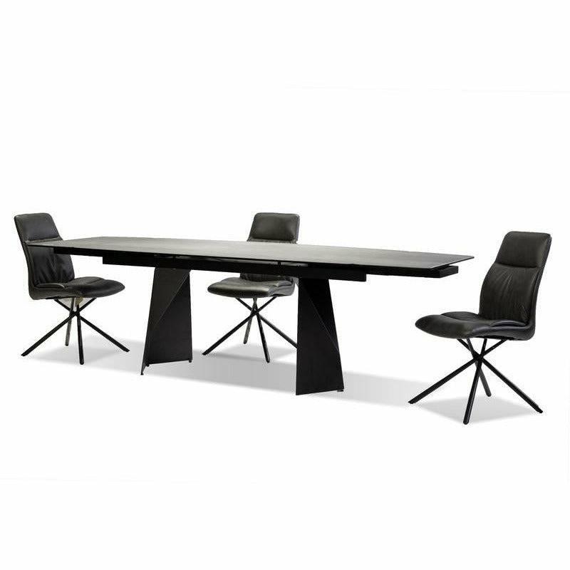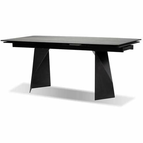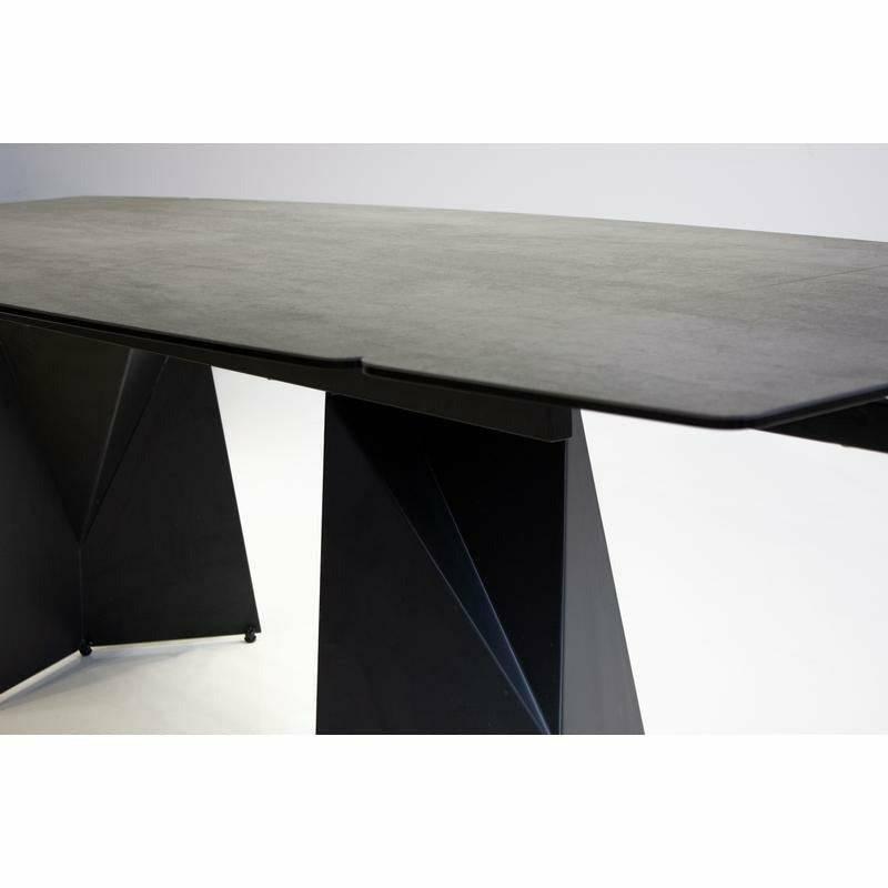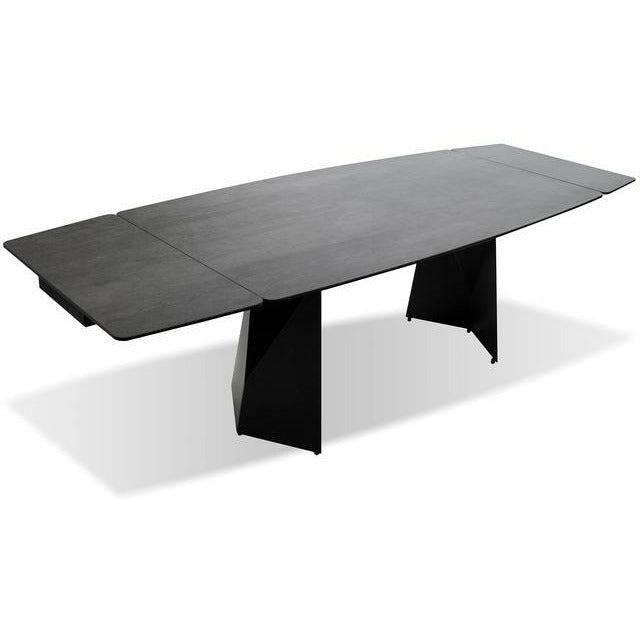 The PRISM Dining Table has two manual extending leaves that are self-storing under the table. It is made with a charcoal powder-coated steel base and the top is made from ceramic and glass that is laminated together. The ceramic has a matte textured finish and looks like real slate stone. The ceramic is scratch proof and stain proof and is easily maintained with soap and water. The top also features a gently curved shape.