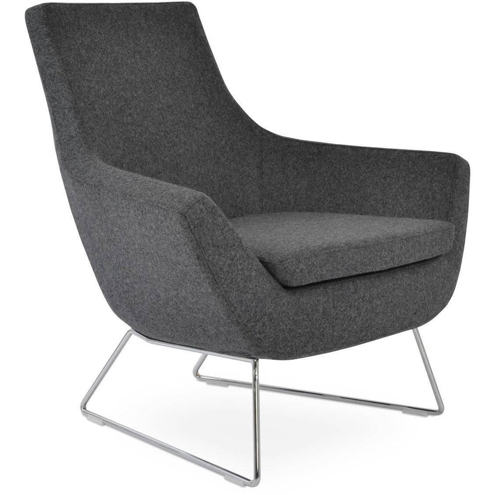 The Rebecca armchair is of modern chic design, with a brilliant steel wire base. Each leg is tipped with a plastic glide embedded into the metal wire. The padded seat cushion enhances the comfort of the chair. The seat has a steel structure with “S” shape springs for extra flexibility and strength. This steel frame is molded by injecting polyurethane foam. The Rebecca seat is upholstered with leather, PPM, or wool fabric. The chair is suitable for both residential and commercial use.