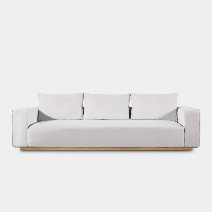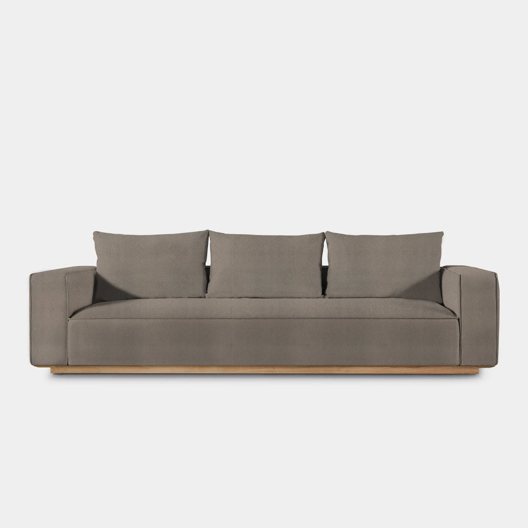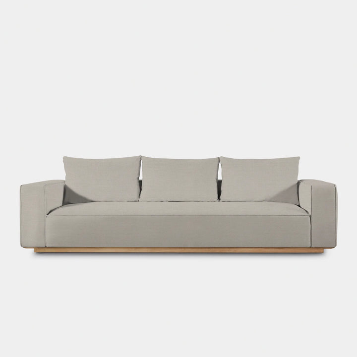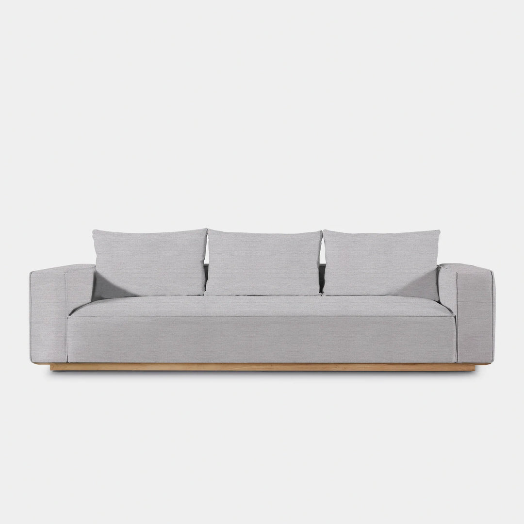Building on our years of experience in outdoor design, the popular fully upholstered Santorini collection offers versatility in modular seating. Our smaller sofa, the Santorini Outdoor 3 Seat Sofa, is pure comfort — sink into an extra generous tight seat cushion with an all-weather suspension system and accent pillows, all floating on a plinth base in a choice of aluminum or teak. This easygoing modular component can be configured to fit an existing smaller space — and is always adaptable to the next space.