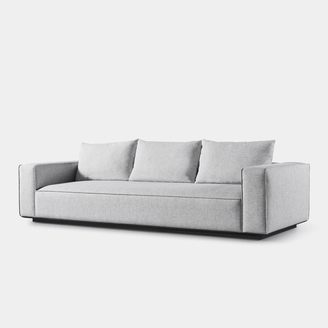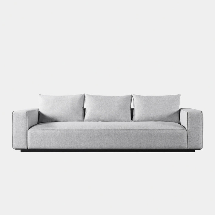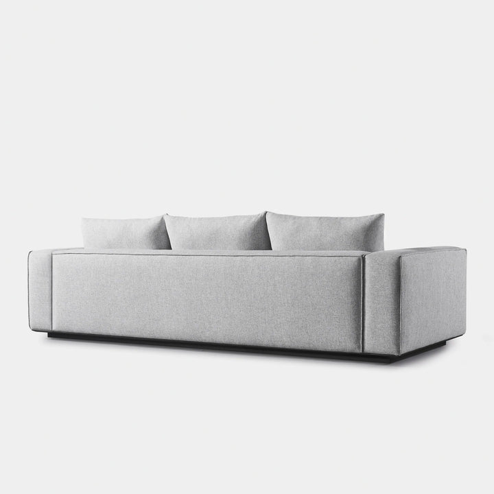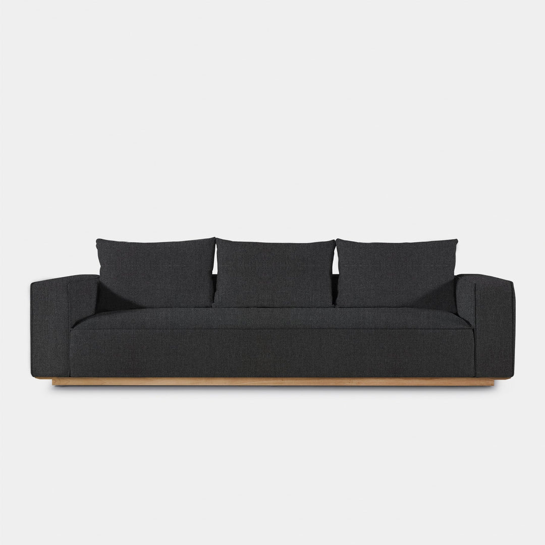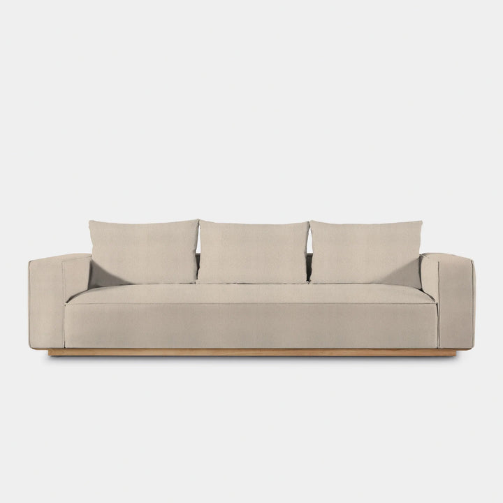 Building on our years of experience in outdoor design, the popular fully upholstered Santorini collection offers versatility in modular seating. Our smaller sofa, the Santorini Outdoor 3 Seat Sofa, is pure comfort — sink into an extra generous tight seat cushion with an all-weather suspension system and accent pillows, all floating on a plinth base in a choice of aluminum or teak. This easygoing modular component can be configured to fit an existing smaller space — and is always adaptable to the next space.