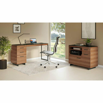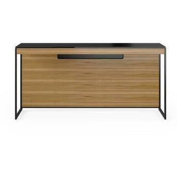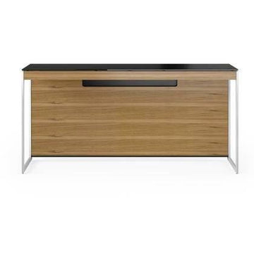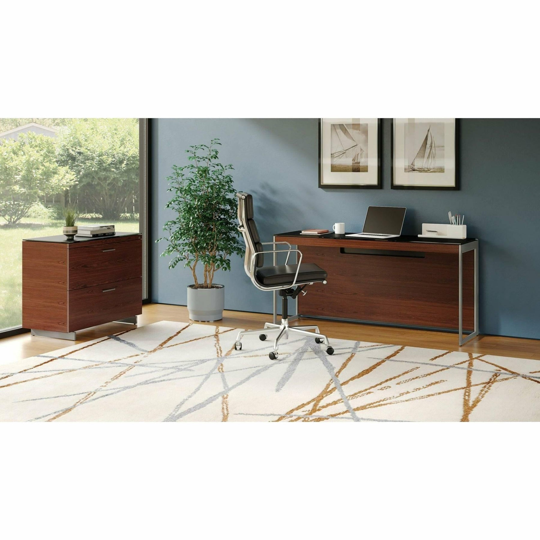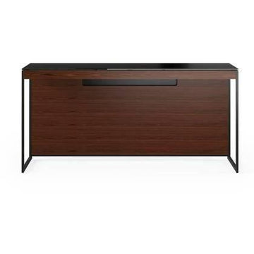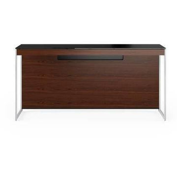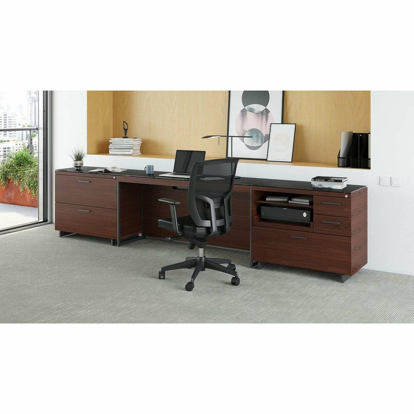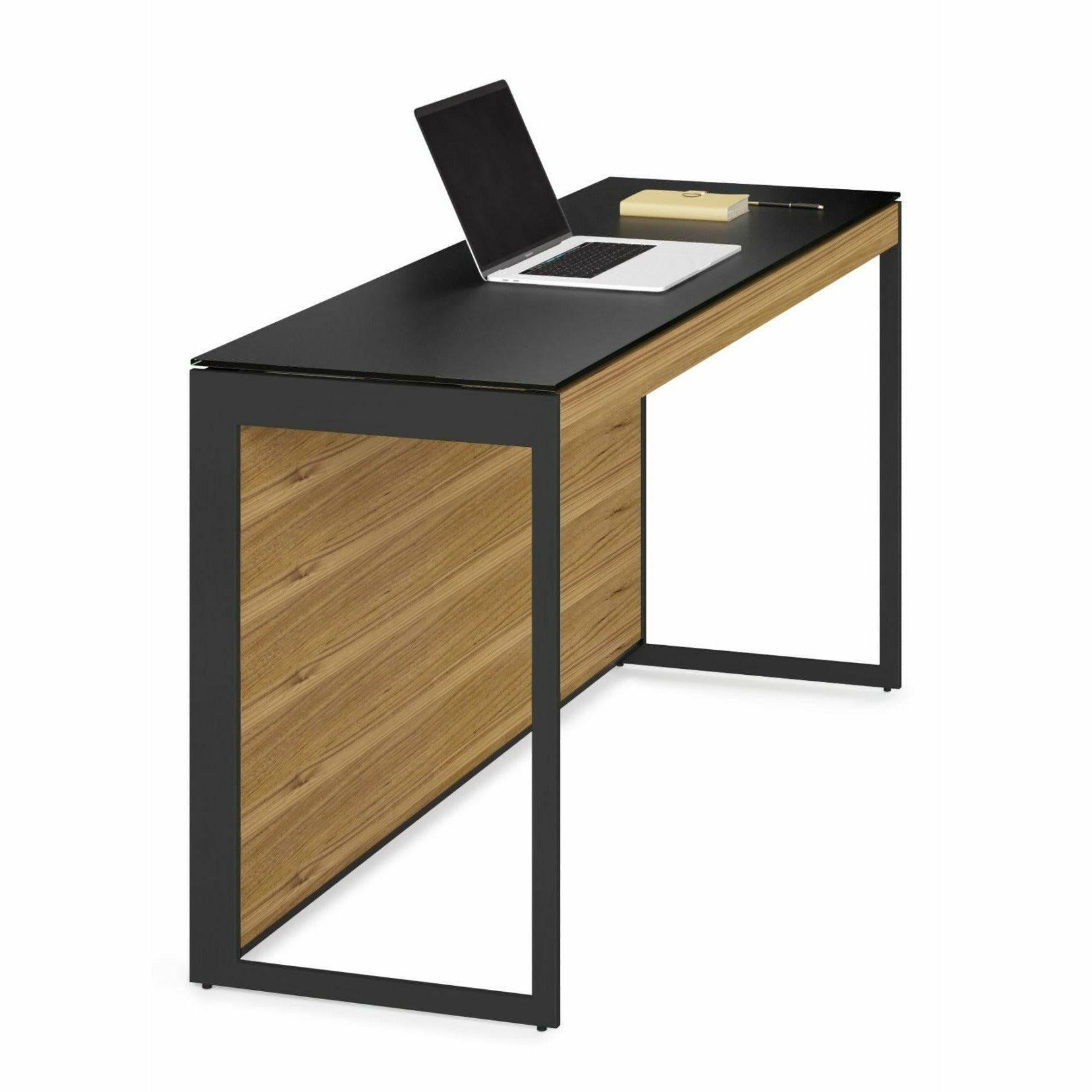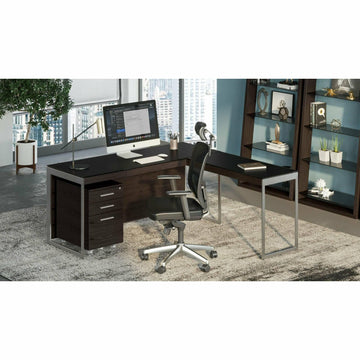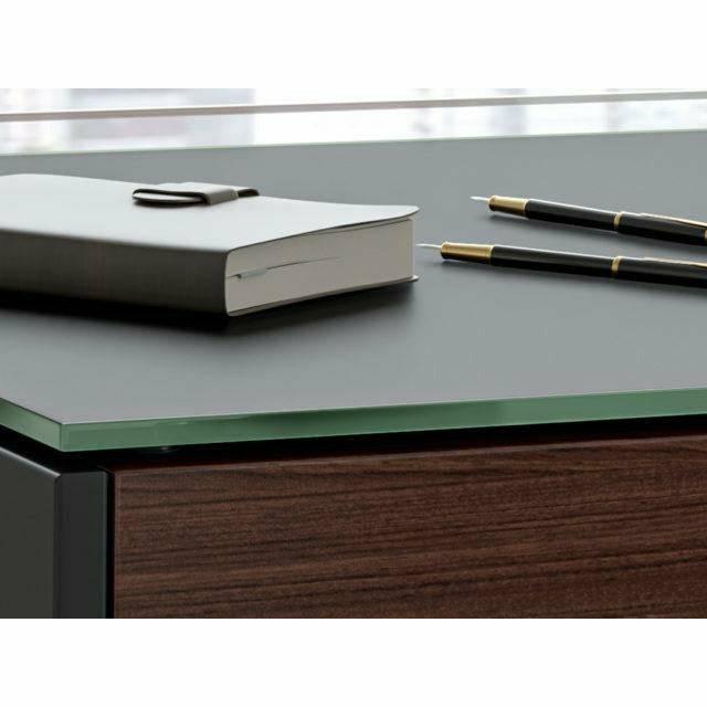 A generous workspace makes the Sequel 20 Laptop Desk 6102 an impressive centerpiece of any corporate space. This highly durable opaque tempered glass has an unbelievably soft finish that provides protection from dings, scratches, and even fingerprints. A generously-sized keyboard drawer includes space for recharging small devices; a flip-down front blend into the desktop when not in use. Lined with nonslip material, contents stay secure while work stays comfortable. A tray under the desk can house a power strip (not included) to keep cables organized and neatly out of sight, accessible through a desktop wire management channel.