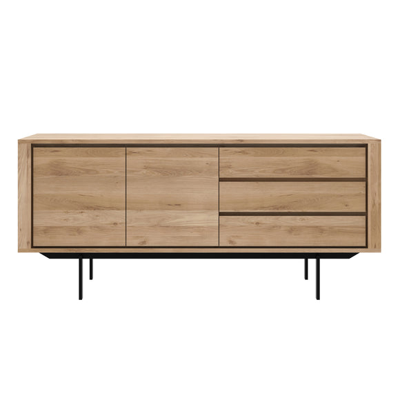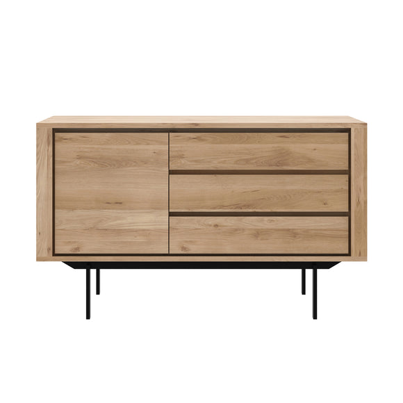 The Shadow collection is defined by its straightforward and robust design, brought to life with clean lines and black metal legs that elevate its look. The Shadow Sideboard offers a simple yet sophisticated solid wood storage solution, perfect for modern living spaces. Crafted from solid oak and finished with hardwax oil, the sideboard allows the natural grain of the wood to shine through, enhancing its elegant simplicity. The combination of one door and three drawers offers ample space for storing everything from fine china and glassware to media devices and electronics. Ideal for a dining room, entryway, or any space that needs stylish, practical storage.