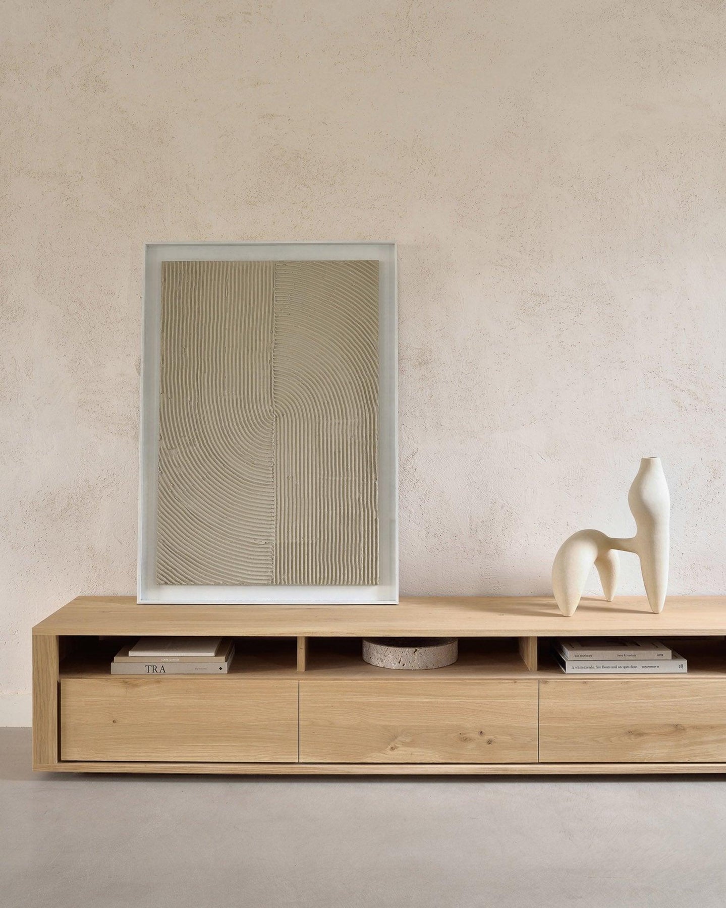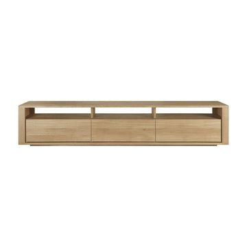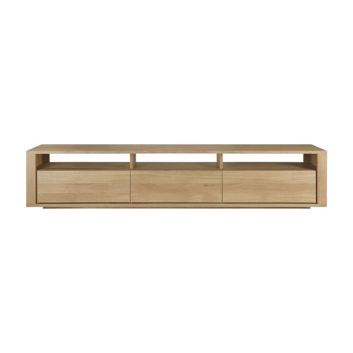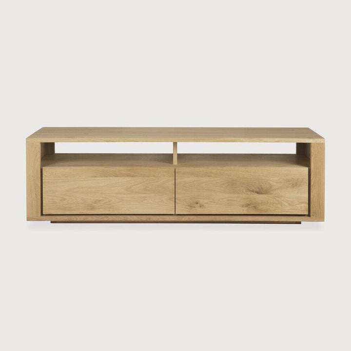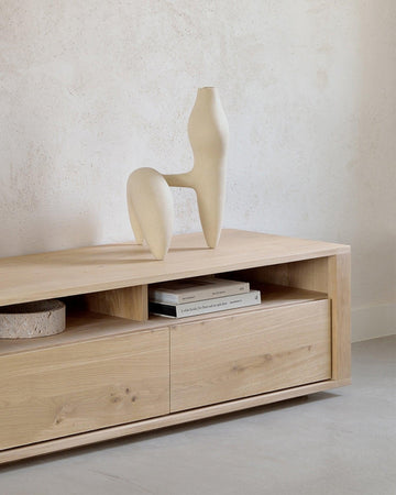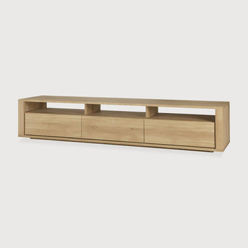 The Shadow Media Console by Ethnicraft stands as a paragon of minimalist elegance, distinguished by its strong, clean lines. This meticulously designed piece effortlessly blends simplicity with advanced functionality, fostering an atmosphere that's both serene and inviting. Expertly crafted from superior solid oak wood and finished with hardwax oil, the Shadow Media Console celebrates the inherent beauty of its material with a design that feels both timeless and contemporary. Available in two sizes—55.5" and 83"—it provides adaptable solutions for any living space. Featuring two drawers for hidden storage and two open compartments for easy access to your electronics, it ensures a tidy and stylish living area. Its capacity to harmonize with diverse interior styles, including farmhouse modern, Scandinavian, and coastal, positions the Shadow TV Cupboard as a flexible and essential addition to any dwelling.