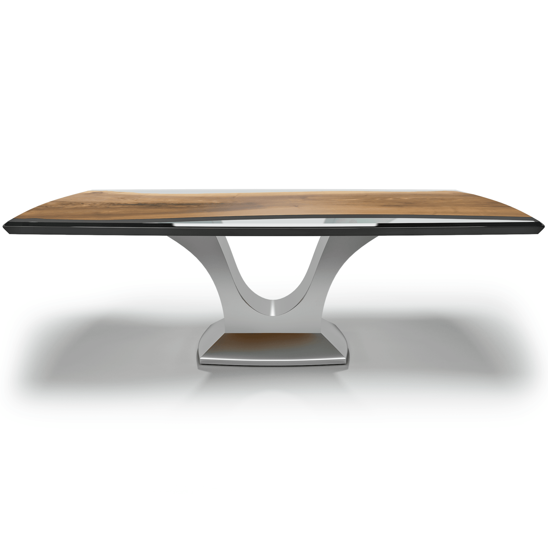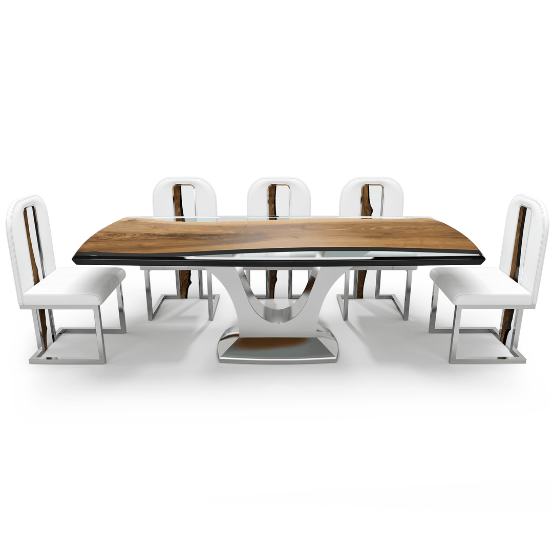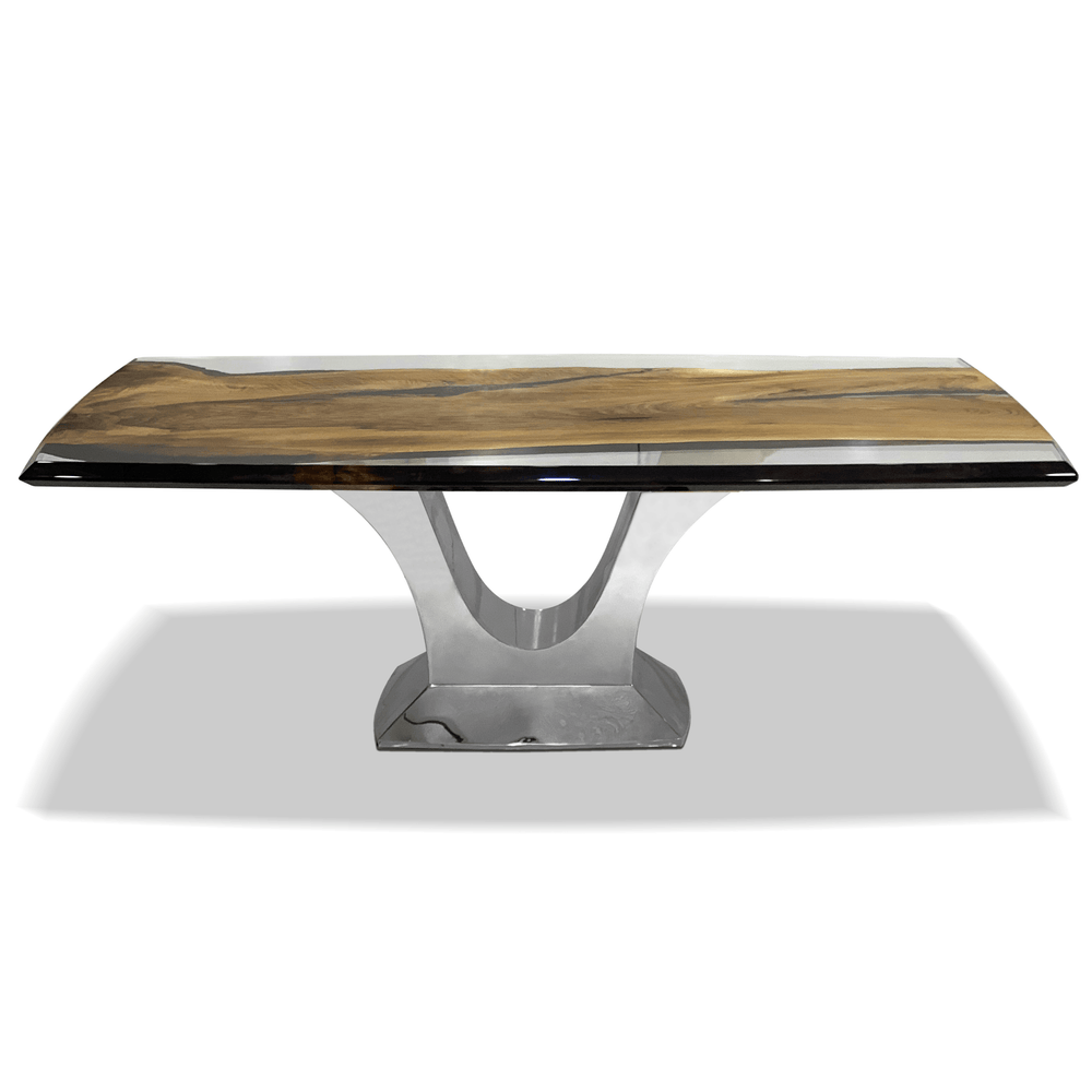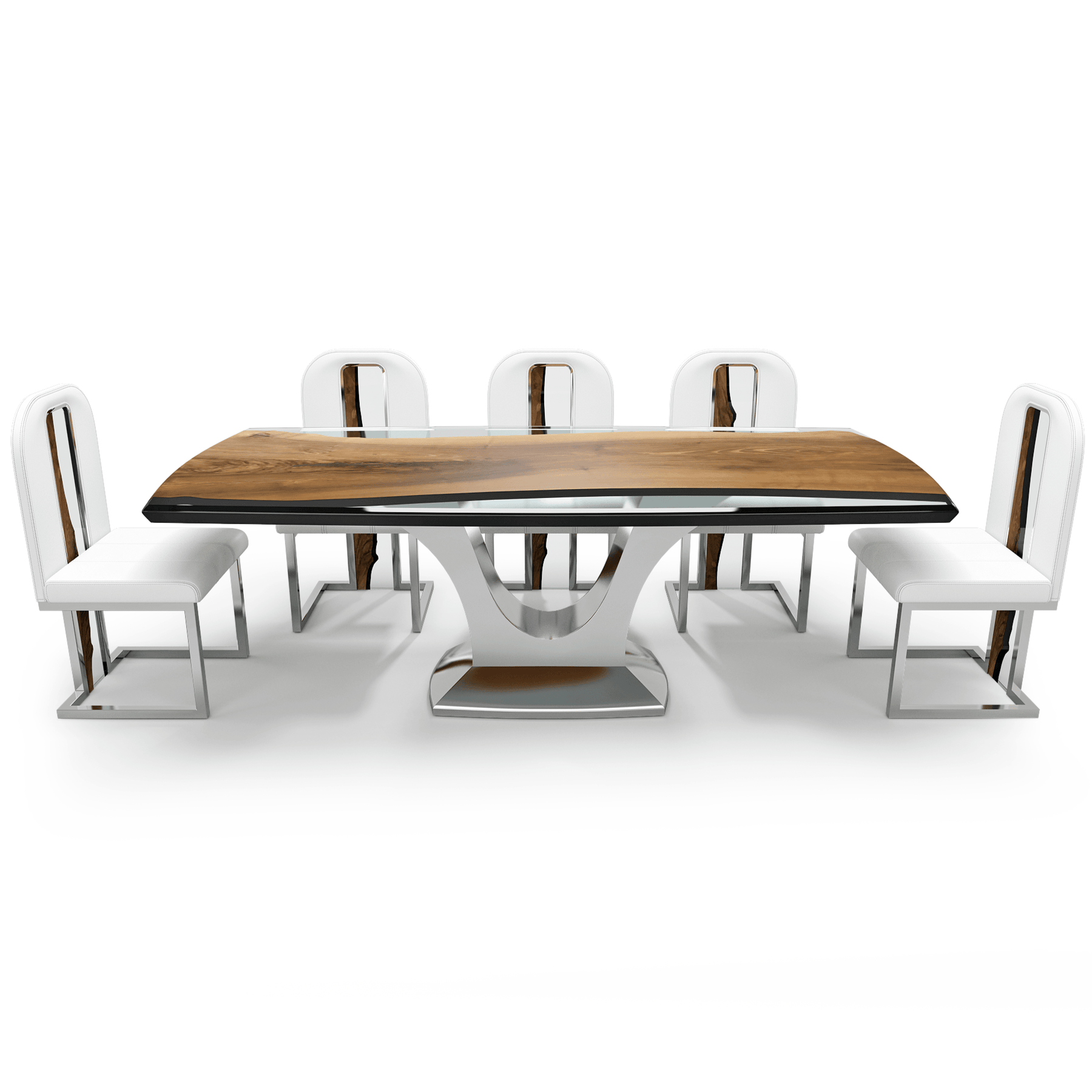 The Arditi collection introduces a stunning and unique Signature Walnut Dining Table that combines wood's natural beauty with resin's durability. The modern design of this dining table is sure to make a statement in any dining room. The combination of resin and wood creates a visually striking contrast that sets it apart from traditional wooden tables. This dining table is durable and easy to maintain and clean. The resin coating protects the wood from scratches and spills, making it perfect for daily use. With its clean lines and sleek design, this dining table from the Arditi collection will be the focal point of any dining area. Upgrade your dining experience with the Arditi resin wood dining table today.