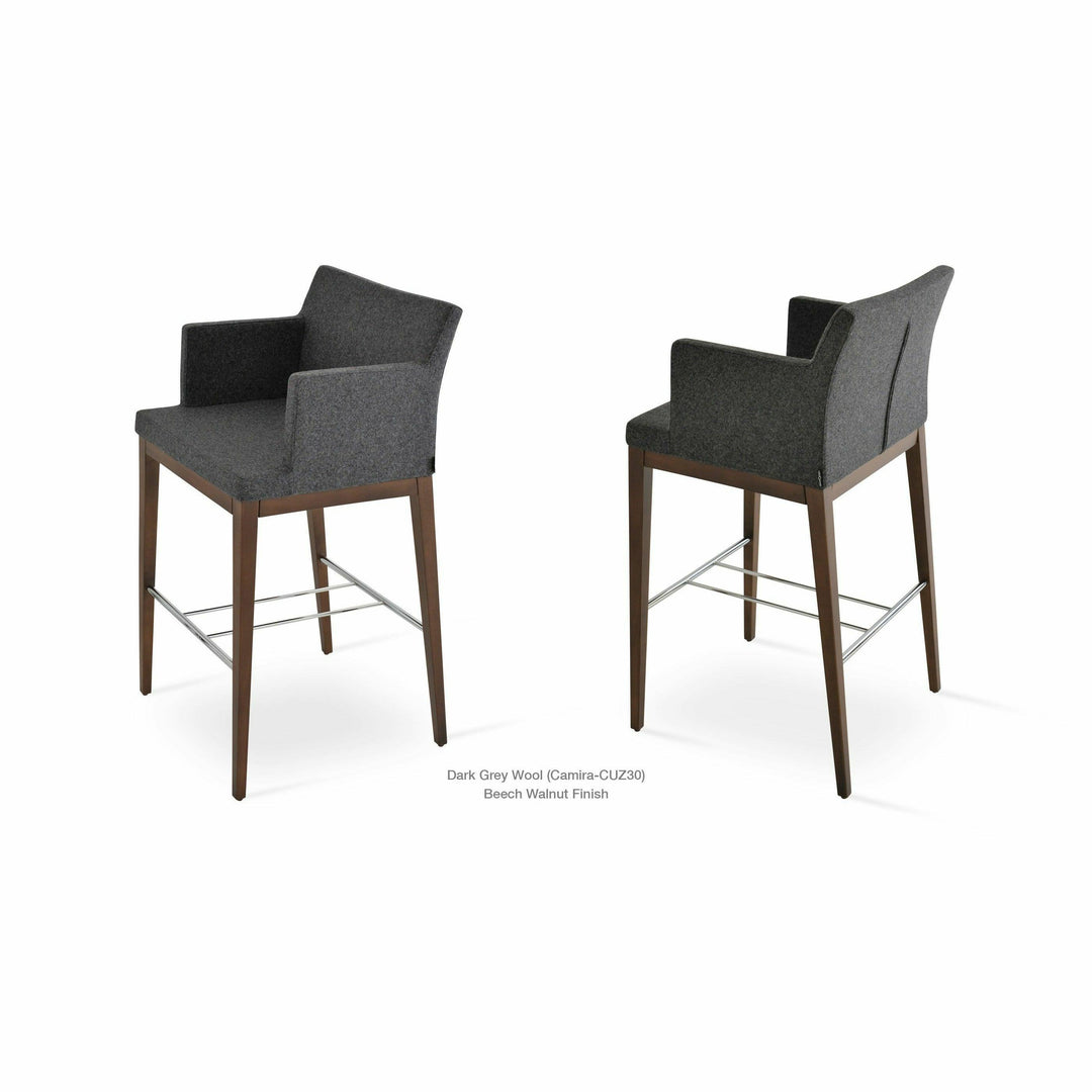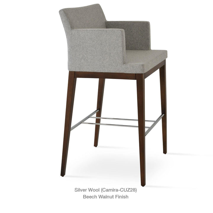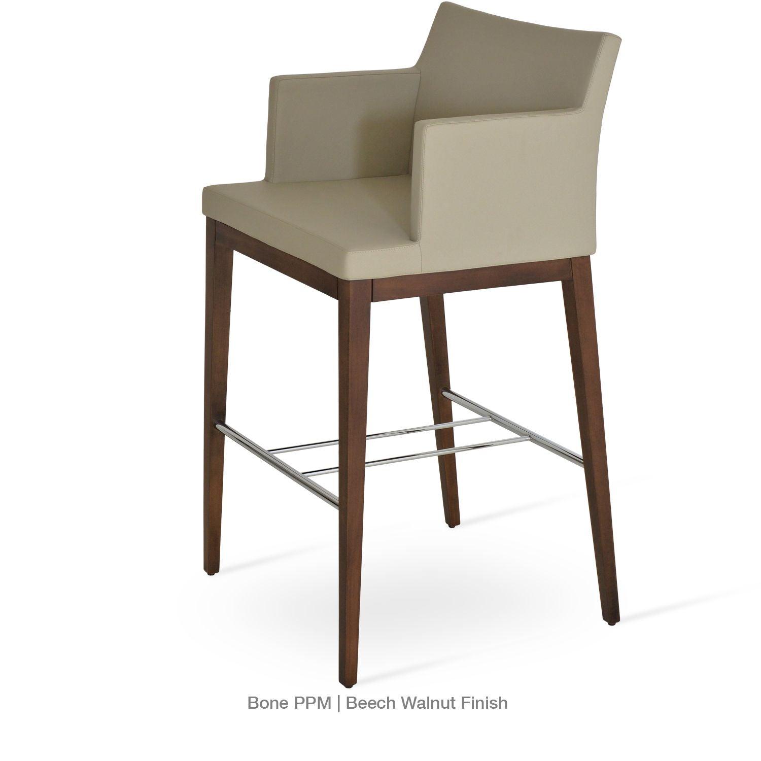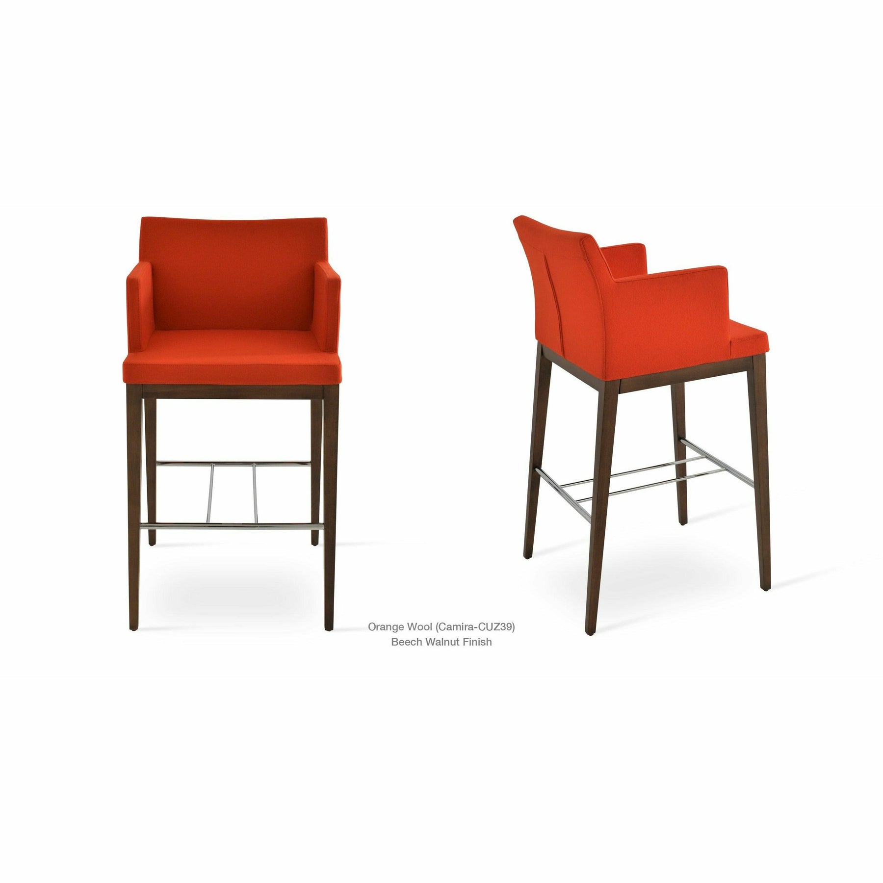 The Soho Wood Stool is a contemporary bar and counter stool with a comfortable upholstered seat and backrest. The seat has a steel structure with “S” shape springs for extra flexibility and strength. This steel frame is molded by injecting polyurethane foam. The Soho seat is upholstered with a removable velcro-enclosed leather, PPM, or wool fabric slip cover. The stool is suitable for both residential and commercial use.