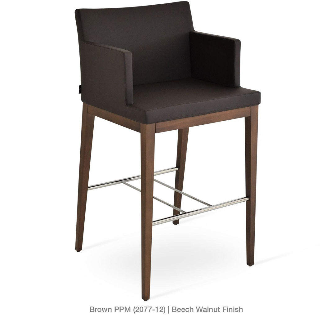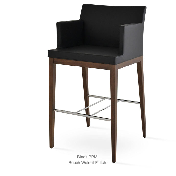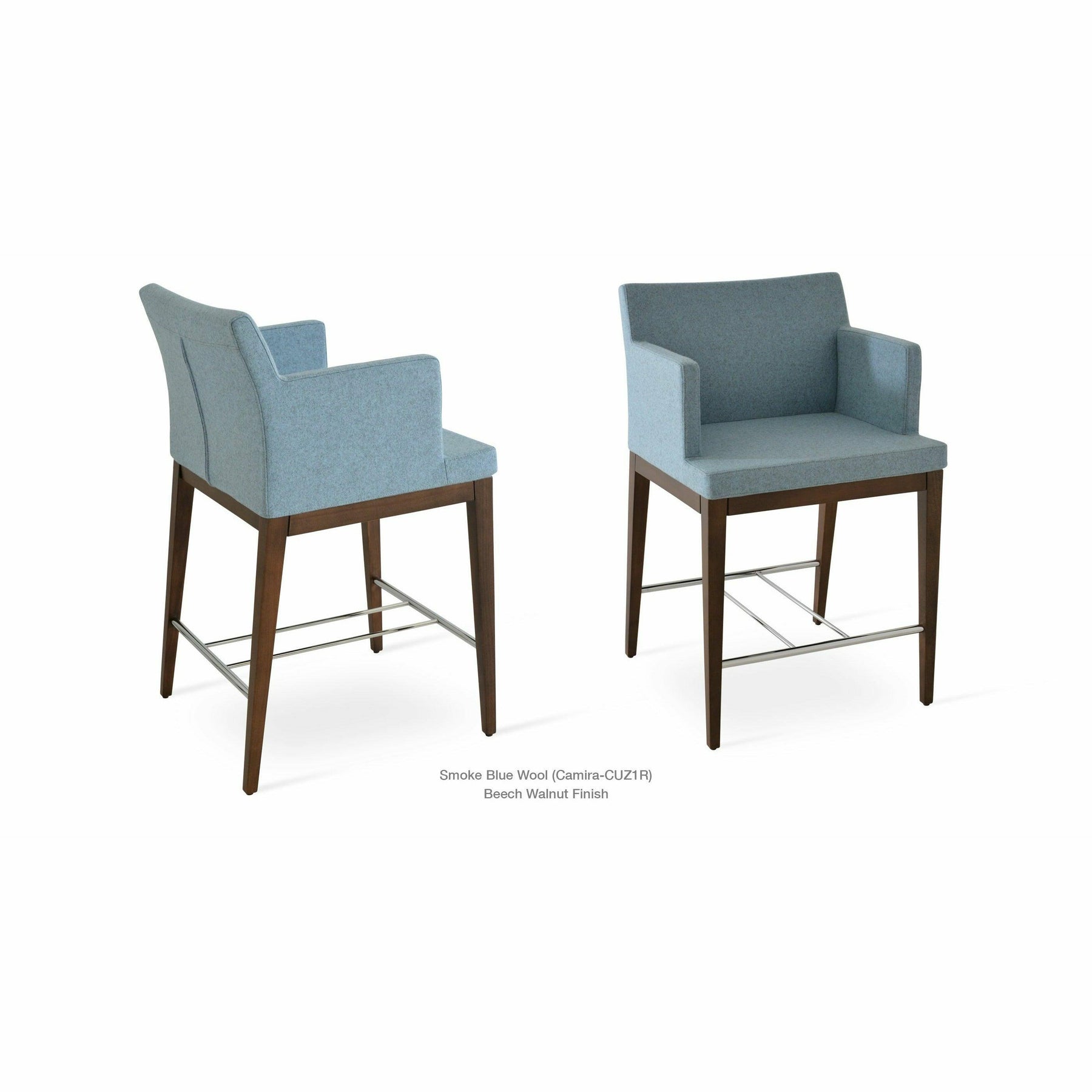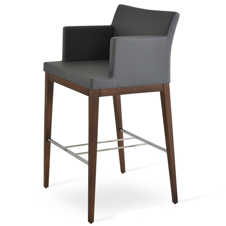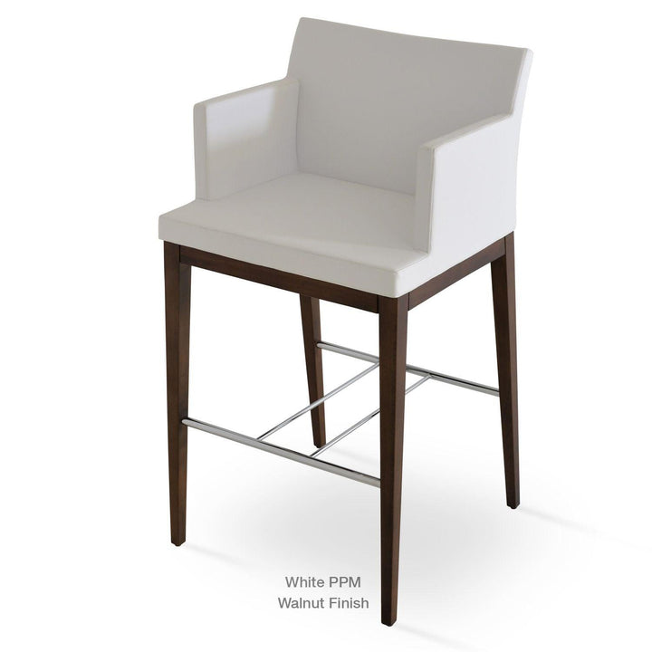 The Soho Wood Stool is a contemporary bar and counter stool with a comfortable upholstered seat and backrest. The seat has a steel structure with “S” shape springs for extra flexibility and strength. This steel frame is molded by injecting polyurethane foam. The Soho seat is upholstered with a removable velcro-enclosed leather, PPM, or wool fabric slip cover. The stool is suitable for both residential and commercial use.