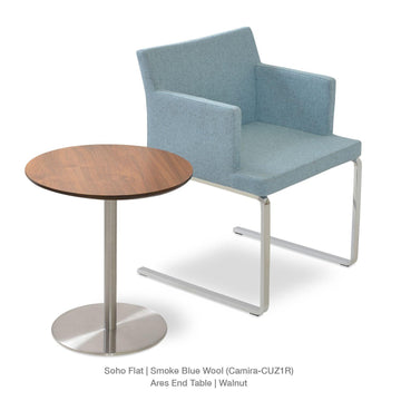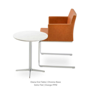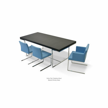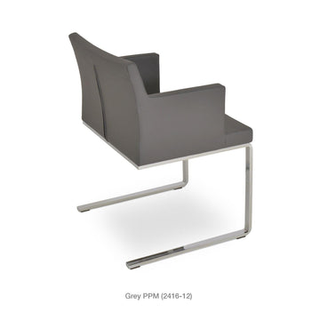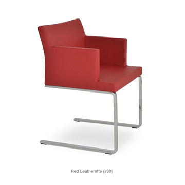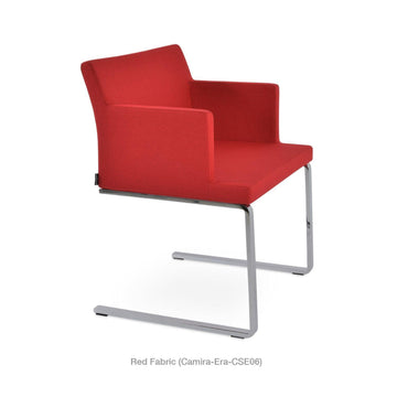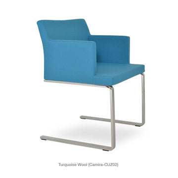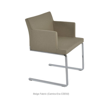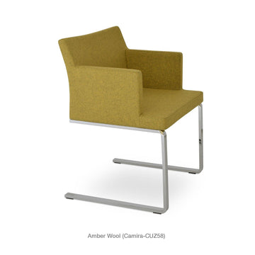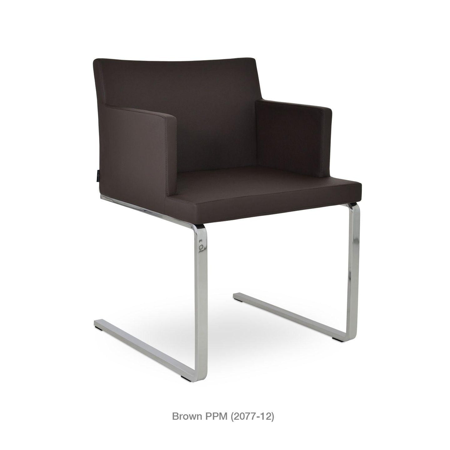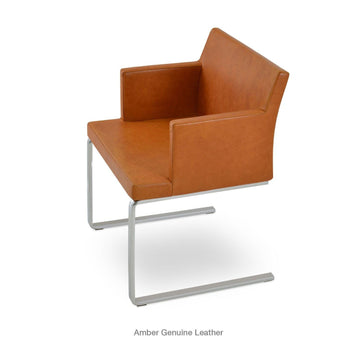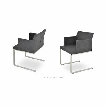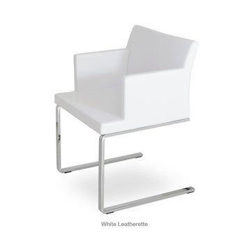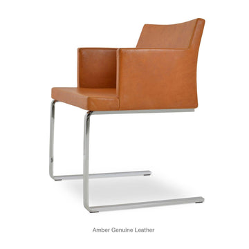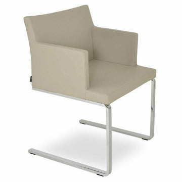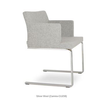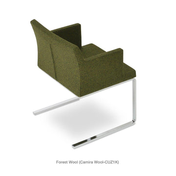 The Soho Flat Dining Chair is an elegant armchair designed ideally for lounge and waiting areas. The chair has a comfortable upholstered seat and backrest on a chrome solid steel sled leg with embedded plastic gliders on the bottom. This steel frame is molded by injecting polyurethane foam. The seat has a steel structure with “S” shape springs that give extra flexibility and strength to this contemporary chair. The Soho seat is upholstered with a removable velcro-enclosed leather, PPM, wool, and Camira wool fabric slip cover. The chair is suitable for both residential and commercial use.