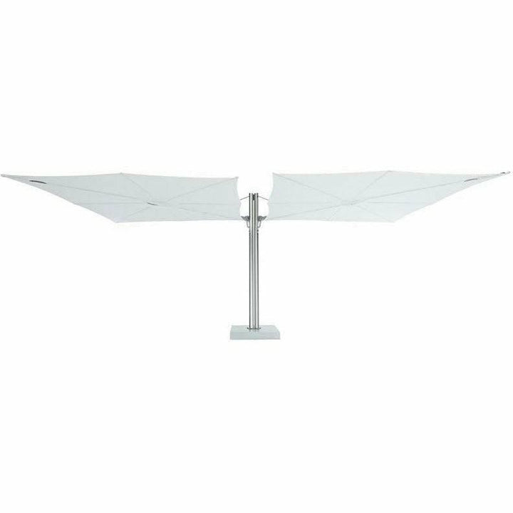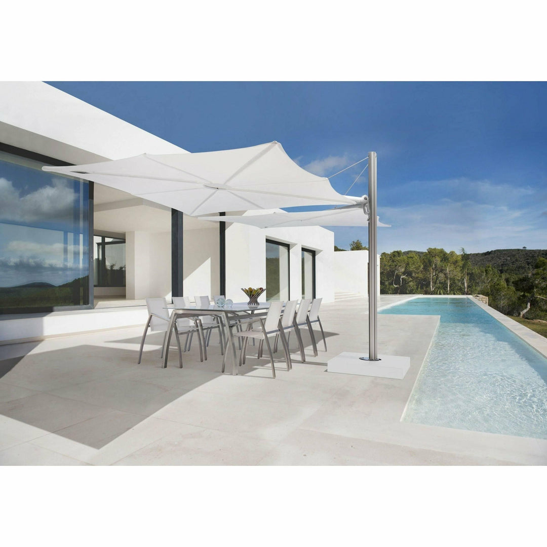 - Standalone umbrella - cantilevered (100 degrees -forward leaning). Can be used with tables without an umbrella hole, chaises, dining and lounging sets. Place 2 (face-to-face) together and it becomes a tent-like canopy.