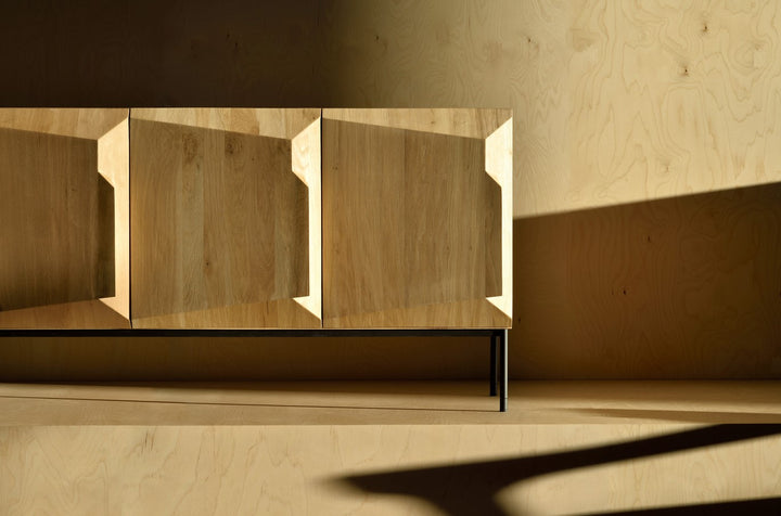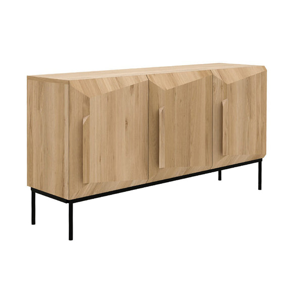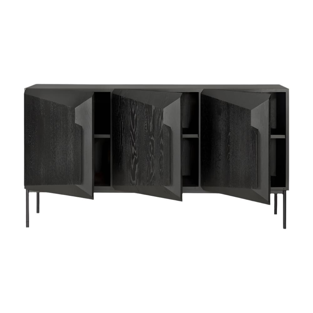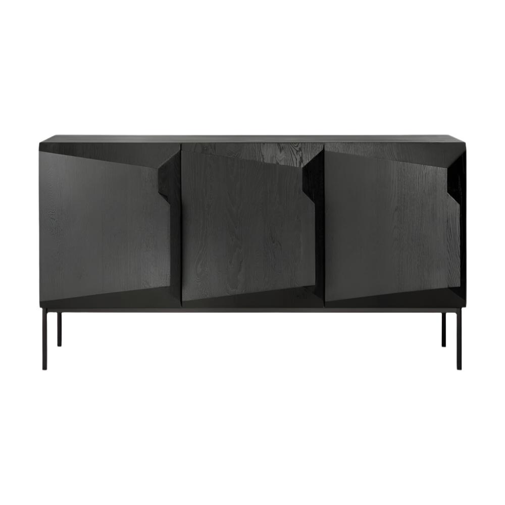 Description: The Stairs 3-Door Sideboard by Ethnicraft showcases the epitome of modern design with its sleek, angular composition and sophisticated form. Crafted from sustainably-sourced solid oak, this piece offers ample storage space behind its three doors, each outfitted with an adjustable interior shelf. The combination of black tainted oak and black metal legs adds a striking visual appeal, making it an ideal addition to any contemporary living or dining space. Perfect for storing dinnerware, electronics, or other household essentials, the Stairs 3-Door Sideboard brings both functionality and style to your home.