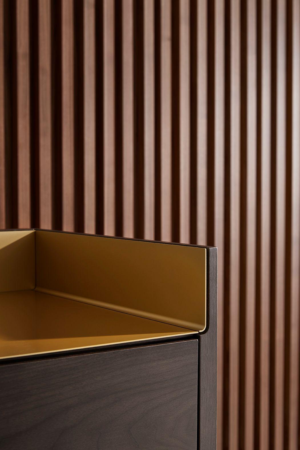 MDF, oak or walnut veneer, anodized aluminum, powder-coated metal