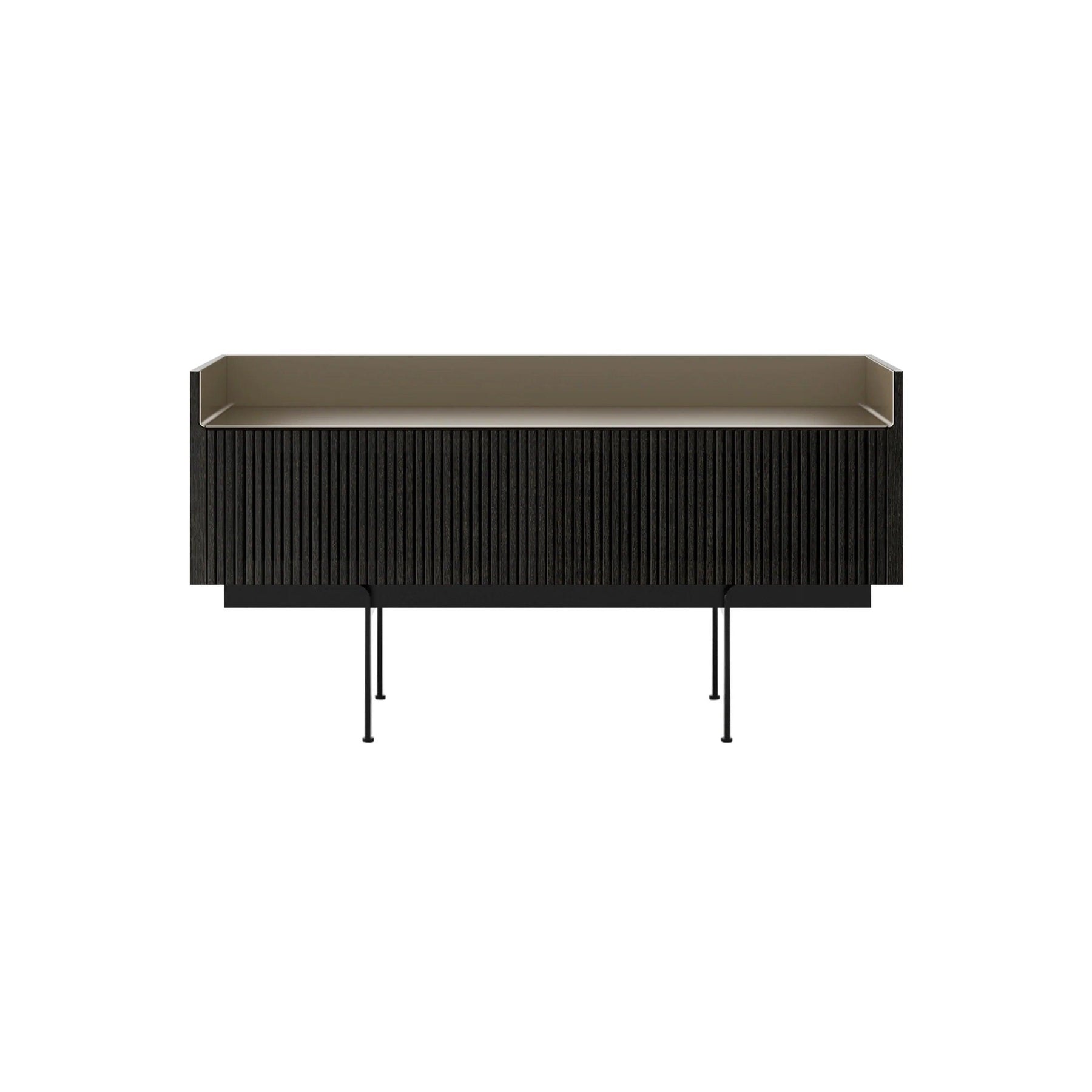 Punt’s signature Stockholm collection takes on a slender look and accommodating height in a Slim version with 2 drop-down slatted TV doors and a height-adjustable shelf inside. With its lustrous aluminum top in a choice of shades, Mario Ruiz’s design comes in a wide range of oak or walnut cabinet finishes, resting on an epoxy powder-coated metal base.