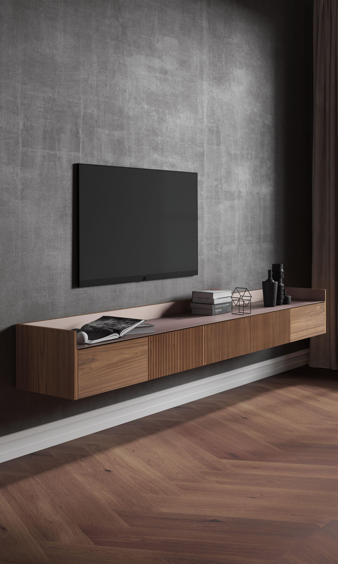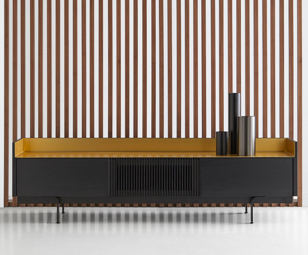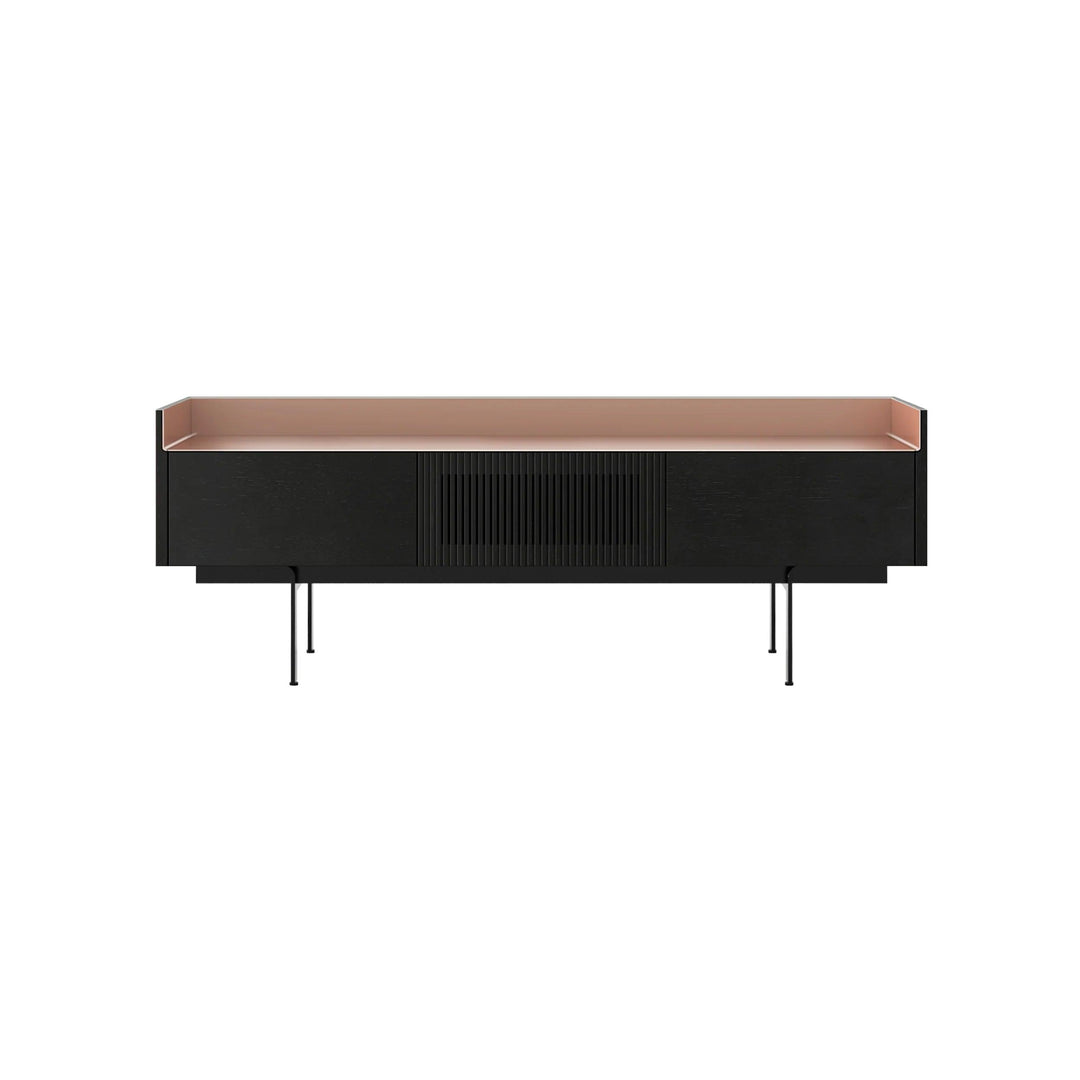 The Stockholm Slim Sideboard: STH353, designed by Mario Ruiz for Punt, artfully blends modern design with practical functionality. This version of the Stockholm Slim series boasts a TV-friendly height and ample storage space, featuring three compartments - two with drop-down doors and one with a pull-out drawer. The design, characterized by a balance of rich oak or walnut veneer and the series' signature gleaming aluminum top, presents an aesthetically pleasing profile that compliments any decor. The sideboard, elevated on a slender metal base, is the epitome of elegant simplicity and versatility.