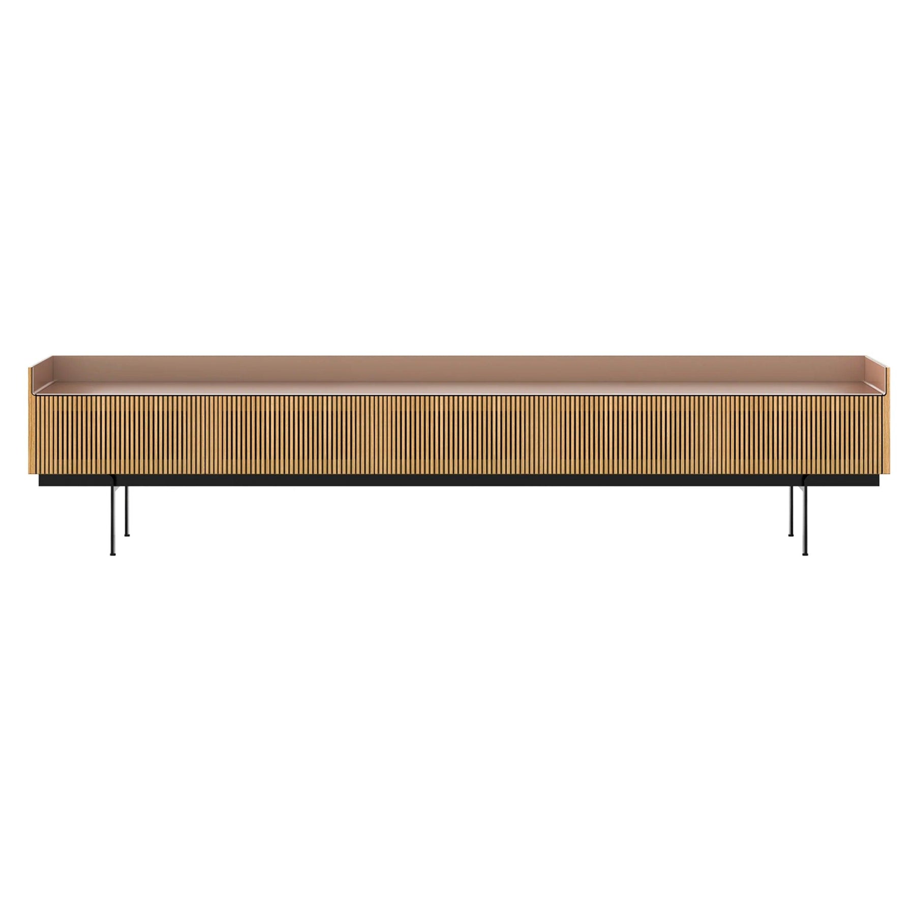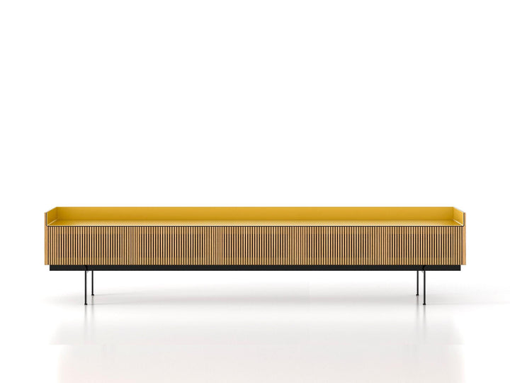 The Stockholm Slim Sideboard: STH557 by Punt is an embodiment of sleek design and spacious storage. Conceptualized by renowned designer Mario Ruiz, this sideboard showcases a splendid slatted facade with five drop-down TV doors, each concealing ample storage within. The piece features a flatscreen-accommodating height and dynamic proportions, perfect for modern living. A lustrous aluminum top in a selection of metallic hues enhances the aesthetic appeal of the sideboard. Crafted in a choice of oak or walnut veneer finishes and settled on a slim metal base, this piece is a showstopper in any setting.