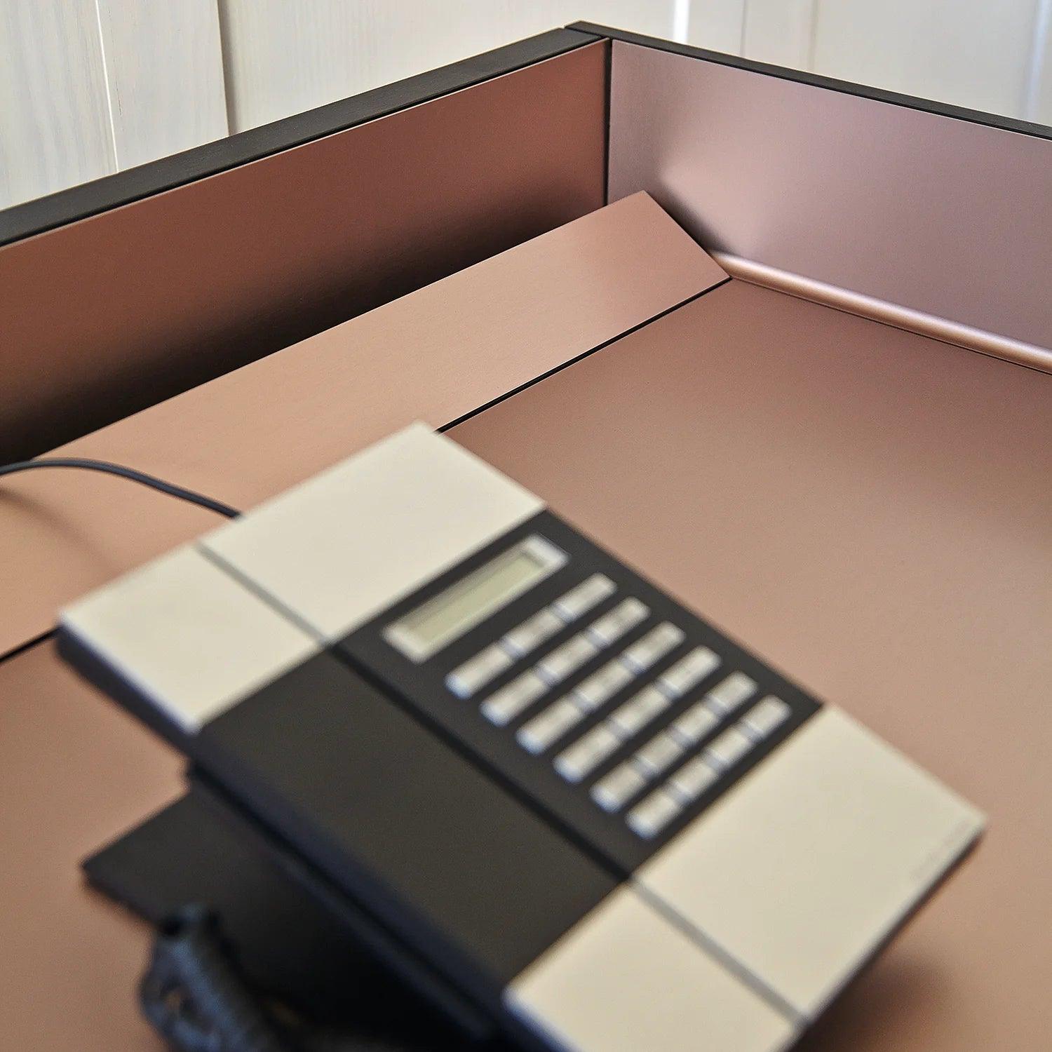 MDF, oak or walnut veneer, anodized aluminum, powder-coated metal