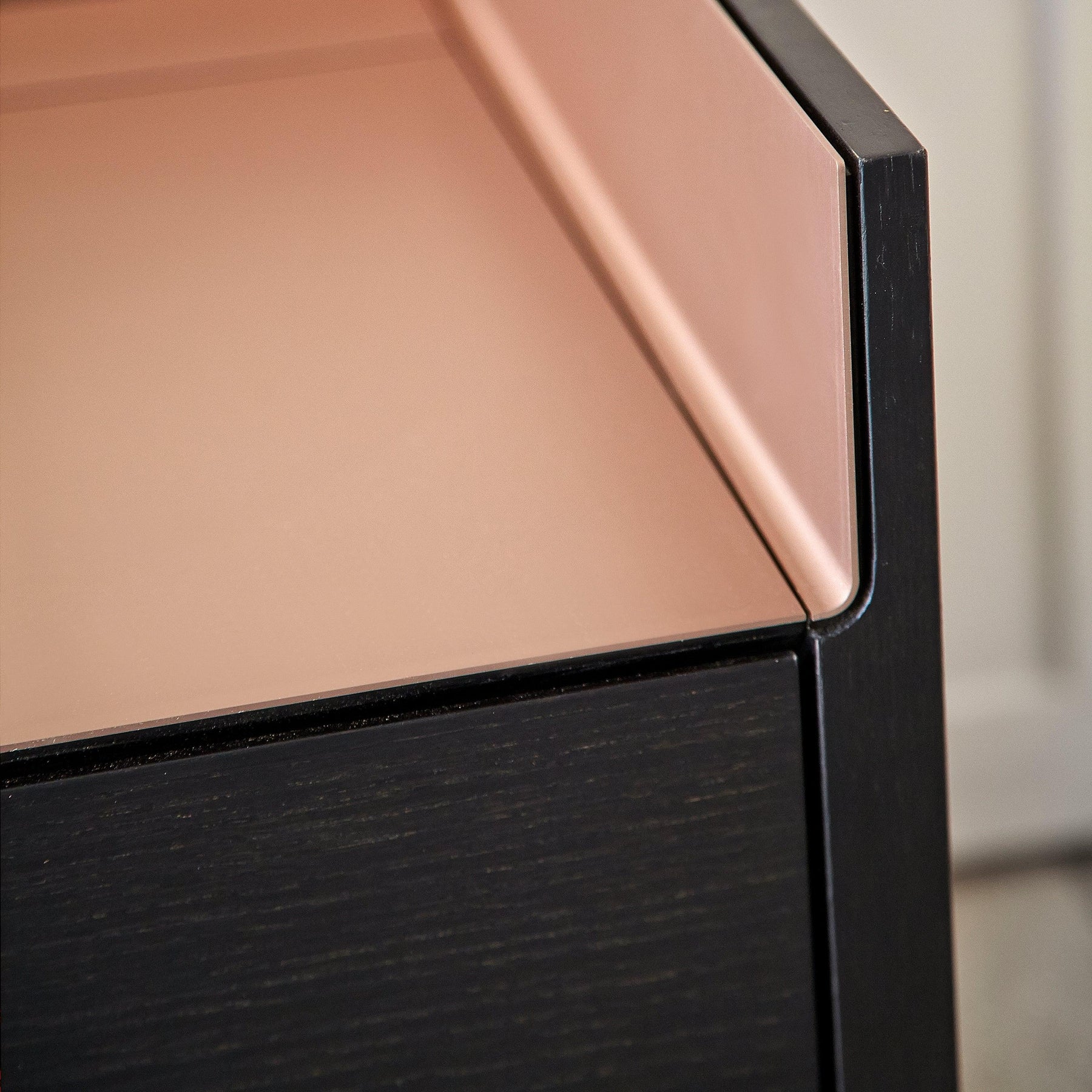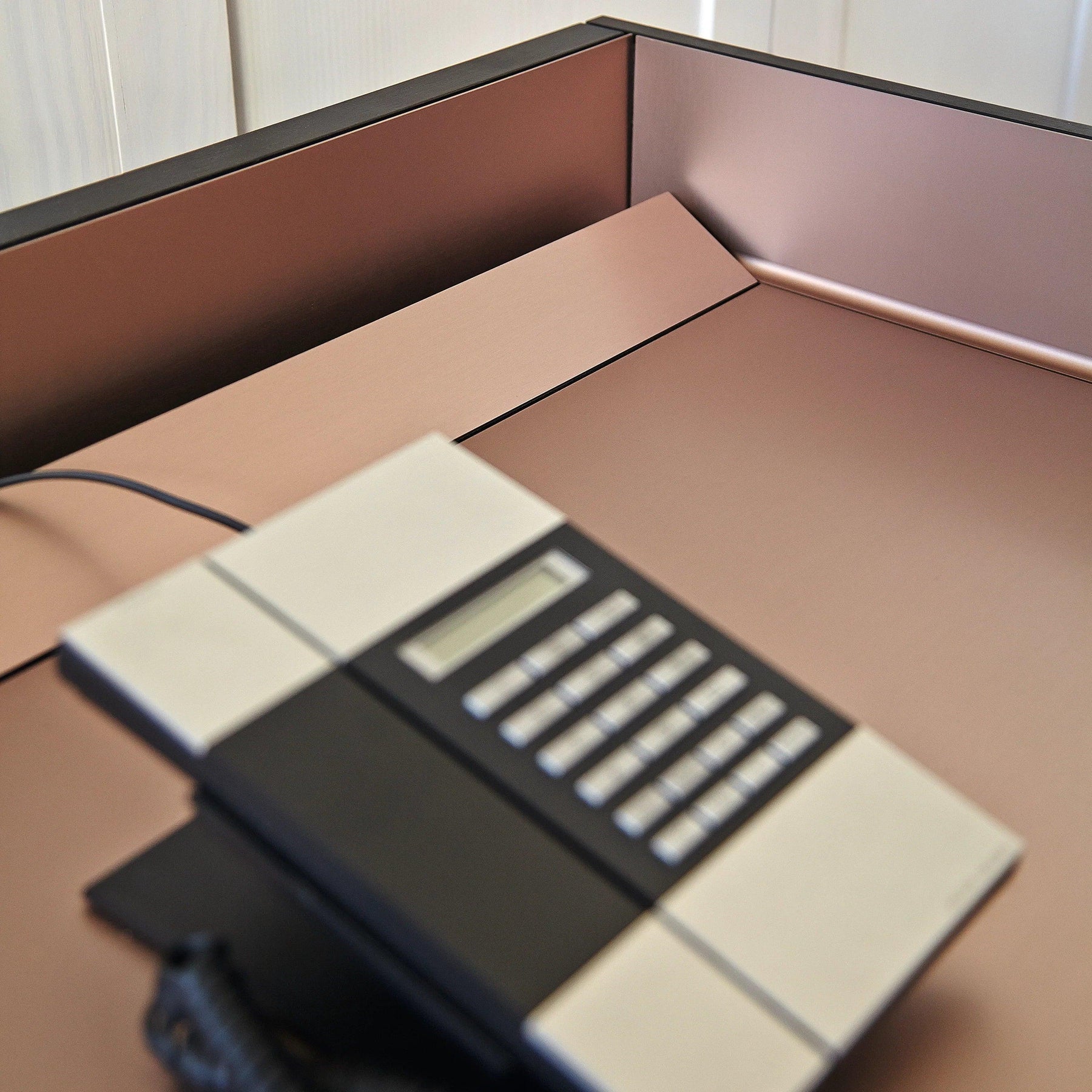 MDF, oak or walnut veneer, anodized aluminum, powder-coated metal