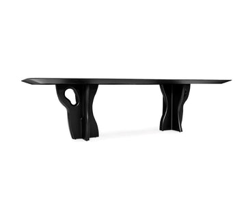 The SUMA Dining Table in Black Oak channels the spirit and grandeur of the Amazon's Sumaúma tree. Crafted to stand as a symbol of nature's enduring presence, the table showcases an imposing base that echoes the complex root structures of the jungle's giants. Clad in a luxurious black oak finish, the SUMA table embodies the mystery and depth of the rainforest, serving as a daily reminder of the rich tapestry of our world's flora. This design not only marks a space with its commanding presence but also infuses it with the indomitable strength found in nature.