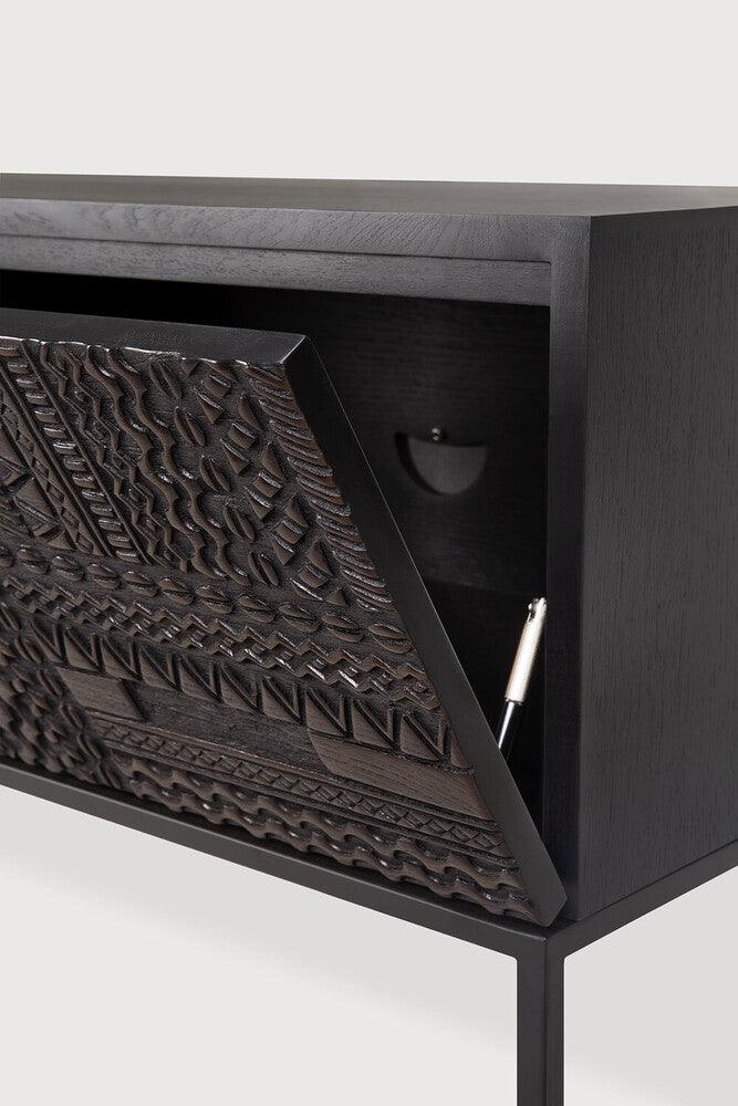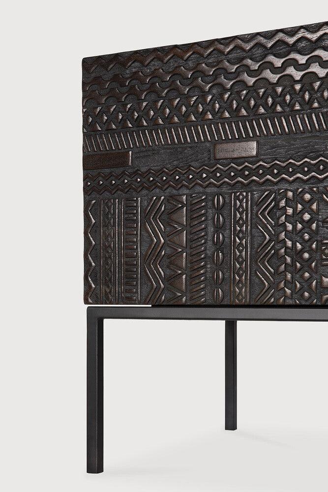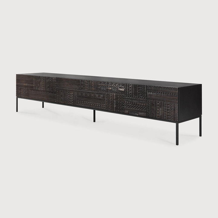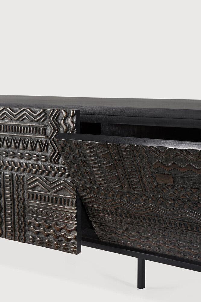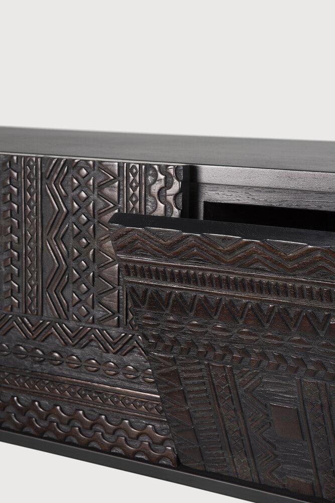 The Tabwa Media Console is a testament to Ethnicraft's dedication to crafting timeless centerpieces that blend minimalistic silhouettes with unique, distinct characters. Drawing inspiration from the Tabwa culture of Central Africa, renowned for their appreciation of linear geometric motifs, this contemporary wooden furniture piece is transformed into a unique work of art. Each pattern on the Tabwa TV Console is meticulously carved by skilled artisans, ensuring that every console stands as a one-of-a-kind piece. This commitment to craftsmanship and cultural heritage makes the Tabwa Media Console not just a piece of furniture but a centerpiece that brings depth and storytelling into your living space.
