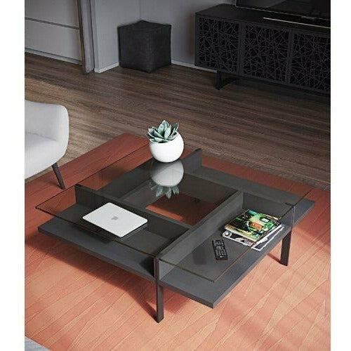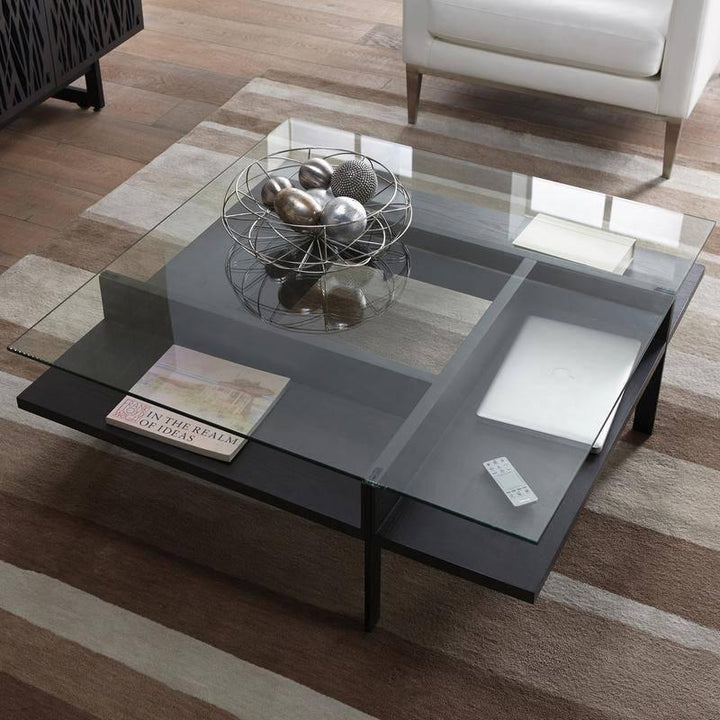 The TERRACE 1150 Square Cocktail Table by BDI is a generously sized coffee table designed to complement sectional sofas effortlessly. This glass-topped table features a unique pinwheel design and offers ample open storage space for all your living room essentials. With its modern aesthetic and versatile functionality, the TERRACE 1150 Square Cocktail Table is a stunning addition to any contemporary living area.