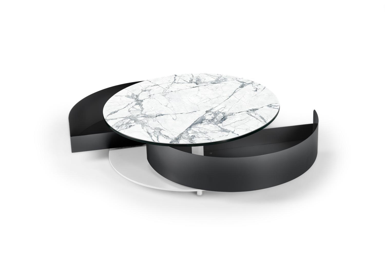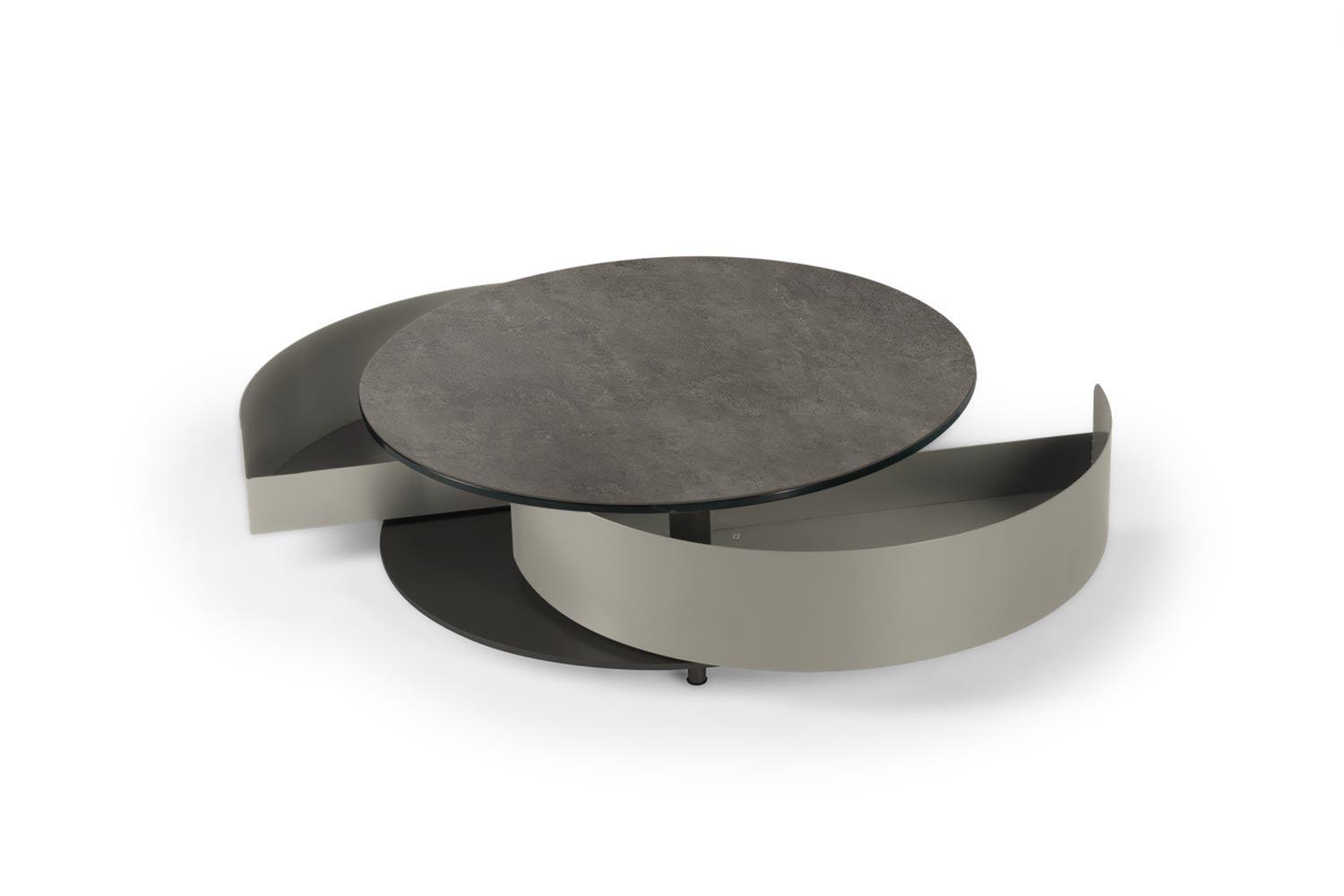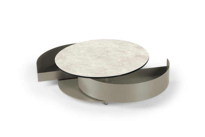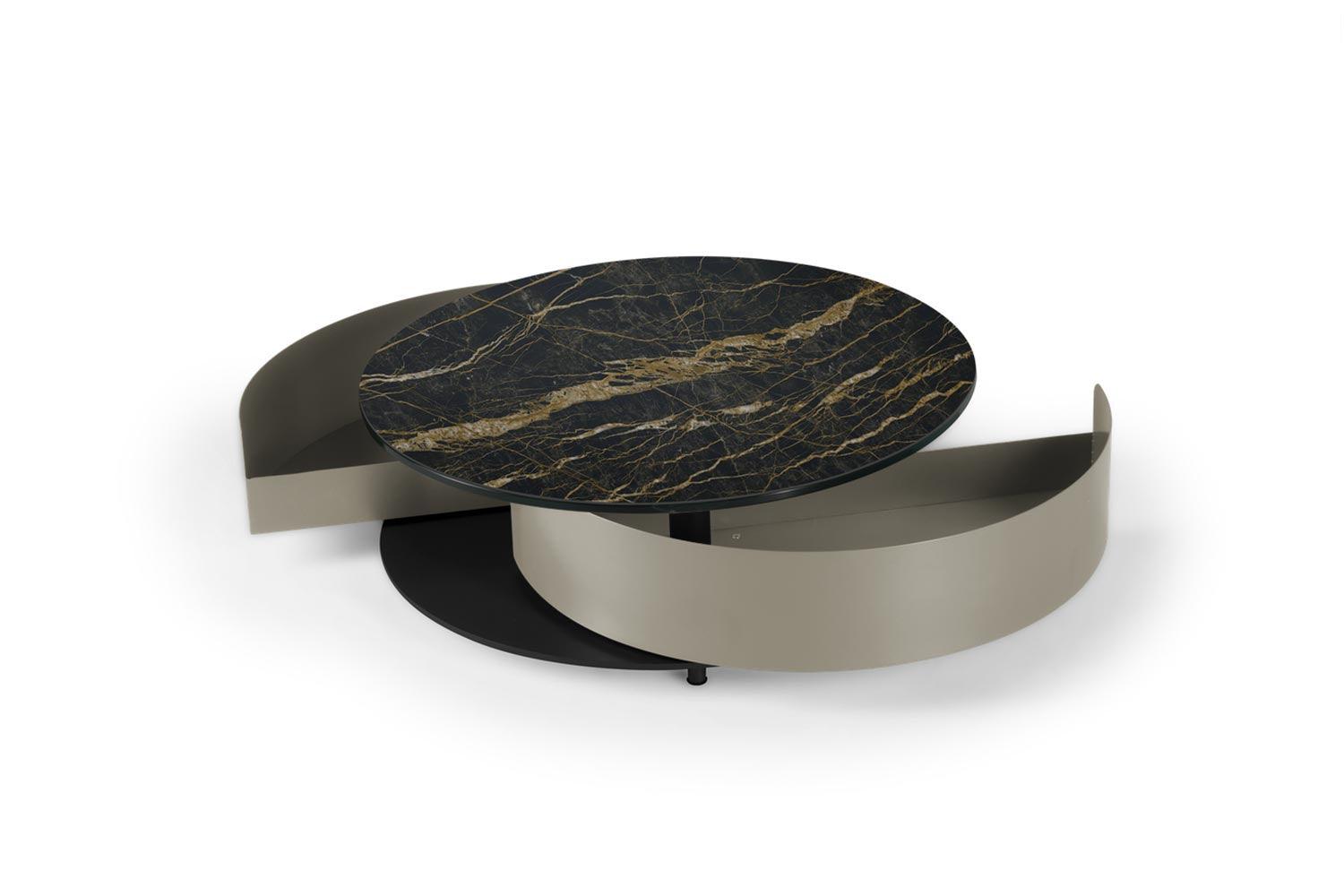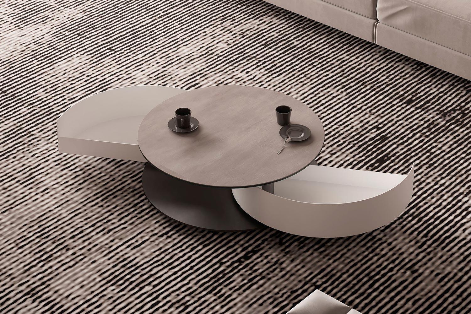 The Theta Coffee Table by Naos, a creation of Andrea Casati, is a seamless blend of practicality and luxury. This Italian-made table is designed to cater to both utility and aesthetic appeal. Featuring two semi-circle pull-out shelves ingeniously tucked underneath, it provides a discreet storage solution for personal effects or items you wish to keep within reach but out of sight. The table’s surface is perfect for serving refreshments or for artistic decoration with small sculptures or floral arrangements. The customization options are extensive – mix and match from a variety of glass and ceramic finishes for the top, complemented by a spectrum of light and cool colors for the metal drawers and base. With such a wide array of combinations available, the Theta Coffee Table can be tailored to fit any interior living space, making it a perfect addition to any contemporary home.