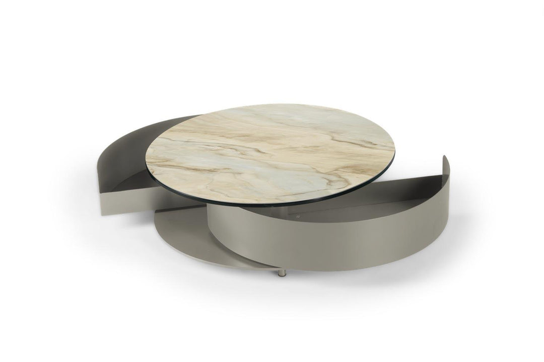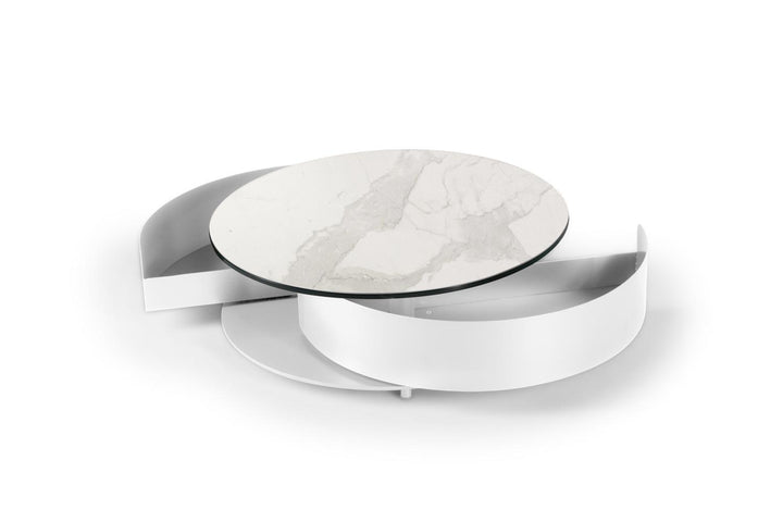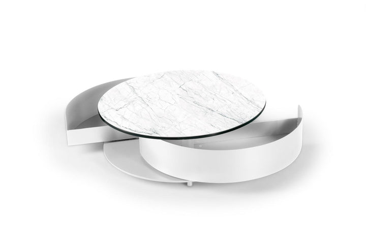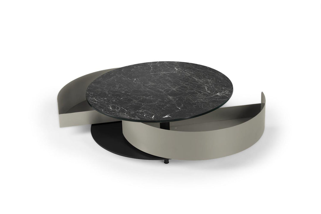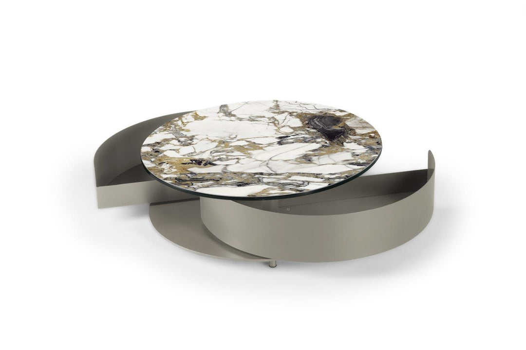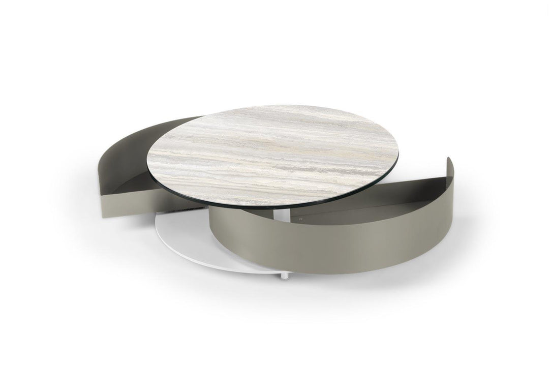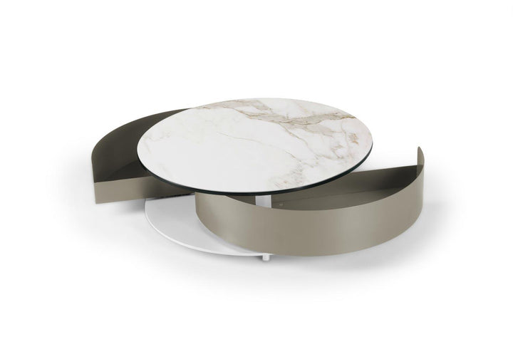 The Theta Coffee Table by Naos, a creation of Andrea Casati, is a seamless blend of practicality and luxury. This Italian-made table is designed to cater to both utility and aesthetic appeal. Featuring two semi-circle pull-out shelves ingeniously tucked underneath, it provides a discreet storage solution for personal effects or items you wish to keep within reach but out of sight. The table’s surface is perfect for serving refreshments or for artistic decoration with small sculptures or floral arrangements. The customization options are extensive – mix and match from a variety of glass and ceramic finishes for the top, complemented by a spectrum of light and cool colors for the metal drawers and base. With such a wide array of combinations available, the Theta Coffee Table can be tailored to fit any interior living space, making it a perfect addition to any contemporary home.