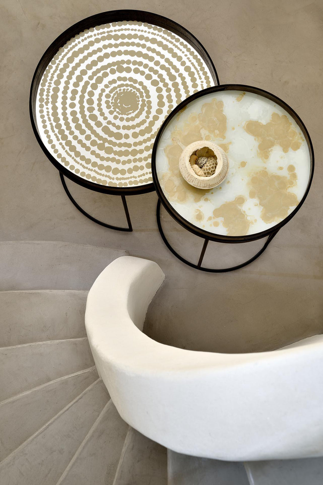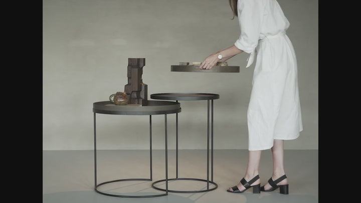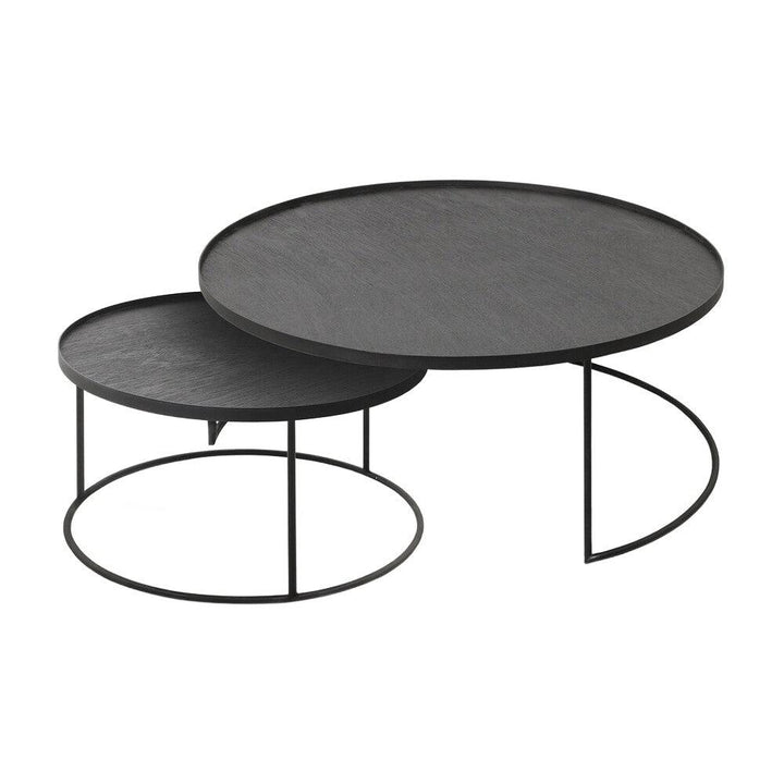 Elevate your living space with the Large Tray Round Coffee Table Set by Ethnicraft. Designed to blend functionality with aesthetic appeal, this set offers a versatile solution for contemporary interiors. Featuring a pair of elegantly designed tables, this set embodies modern simplicity with its clean lines and innovative design. The optional tray top, available in various colors and patterns, allows for easy customization to match any decor style. The robust black metal frame contrasts beautifully with the wooden tops, providing a durable base and a sleek, modern look. Whether used together for a dynamic layered effect or separately to suit different occasions, this coffee table set adds a touch of sophistication to any room.