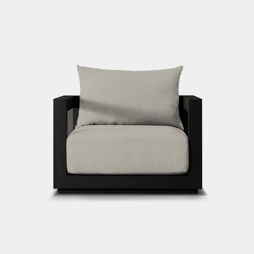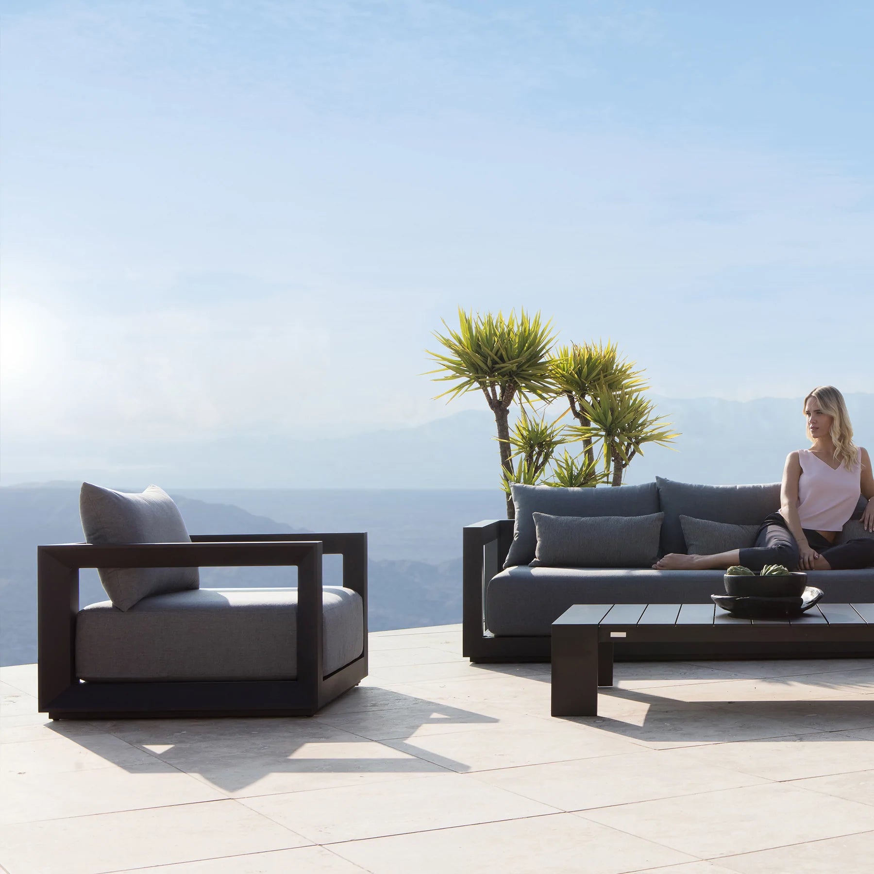 The Our Vaucluse collection explores simple geometries with angular details in a contemporary study of triangles. Surprising and subtle, the Vaucluse 2 Seat Sofa is the perfect escape — lounge on a deep all–weather bench cushion supported by a Batyline sling suspension on a powder coated extruded aluminum frame. Outwardly square geometries actually angle inward in triangular form, creating a dynamic play on shapes that defines the design. This streamlined piece is equally versatile, bringing a sense of balance to any smaller space.