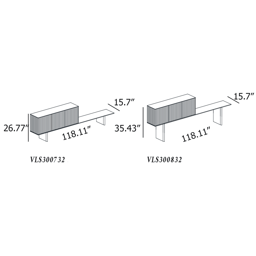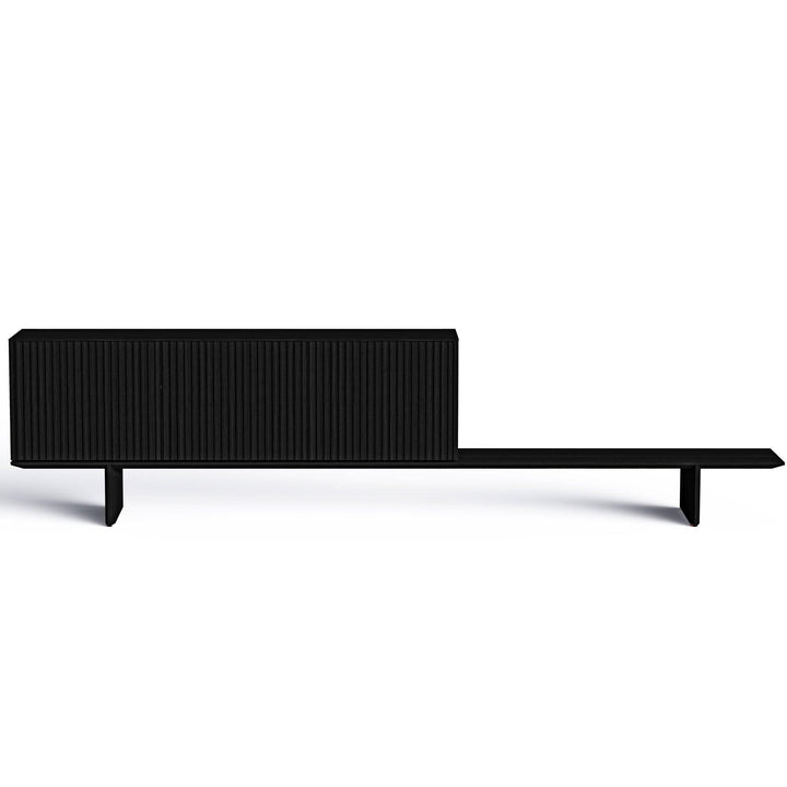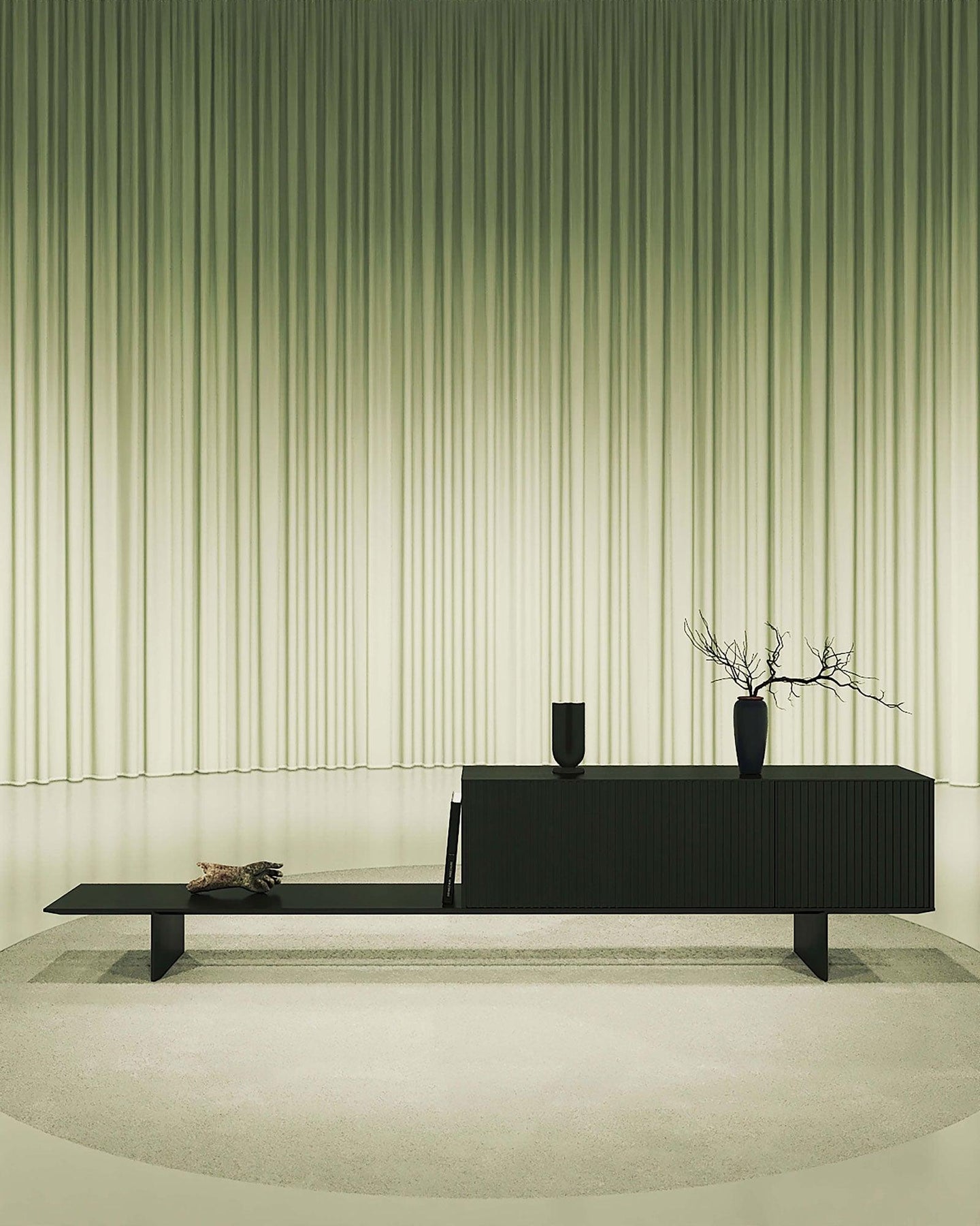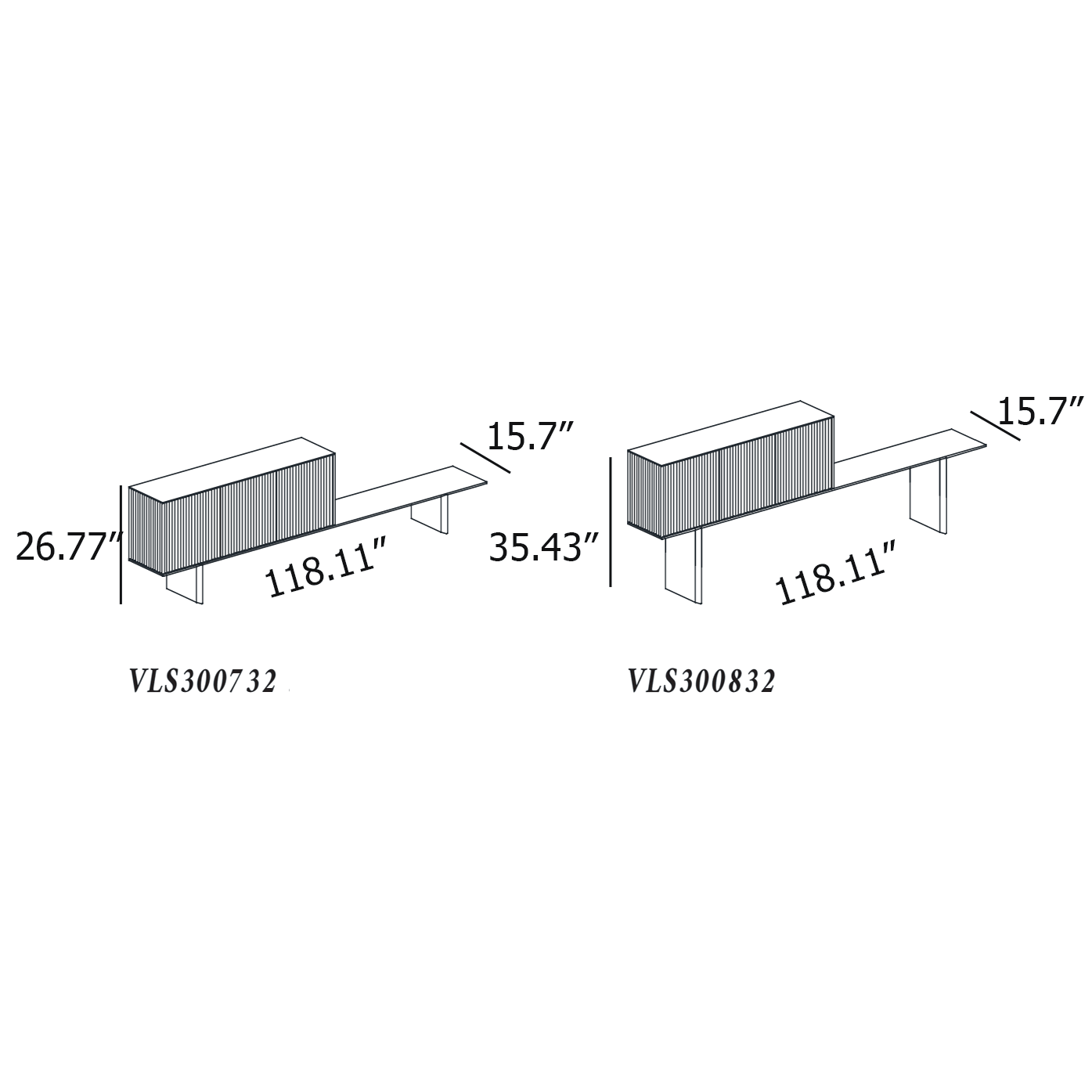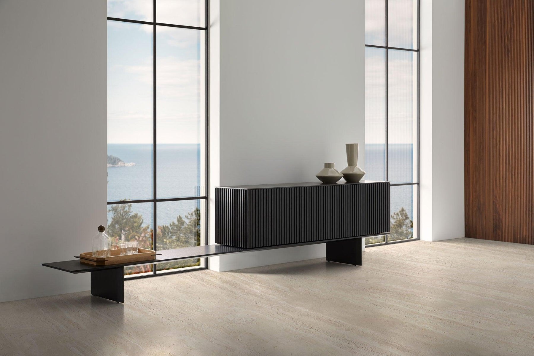 This sideboard stands out with its vertical pattern that gives the piece a unique three-dimensional look. With a geometric and linear container resting on a base, the detailed doors open to reveal two-story shelves offering ample storage. It is almost like a suspended sculpture frozen in time, balancing delicacy with a powerful visual statement. This sideboard can transform any room with its sculptural and timeless design.