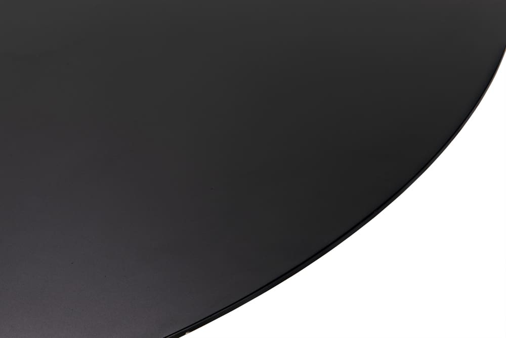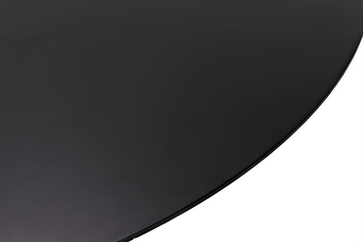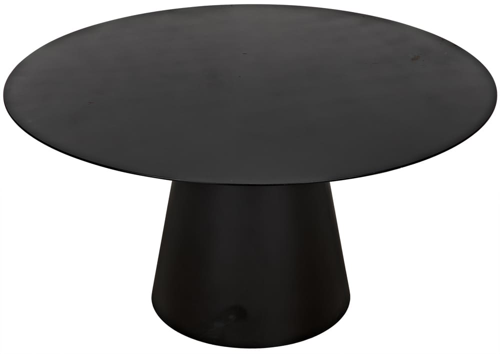 The Vesuvius Dining Table by Noir is a stunning display of minimalist design and expert craftsmanship. Featuring a round top and conical base, this table is handcrafted from industrial steel with a Matte Black finish, blending simplicity with sophistication. Its clean, bold lines and understated elegance make it a versatile centerpiece for modern dining spaces. The handcrafted nature of the table adds unique character, with weld marks and tonal variances that emphasize its artisanal quality.