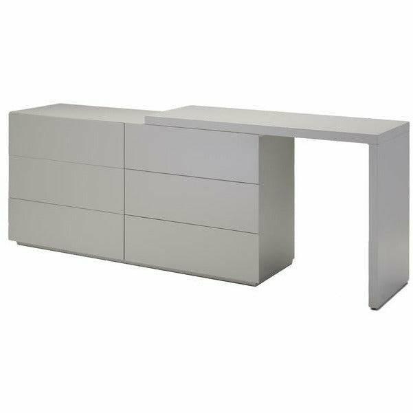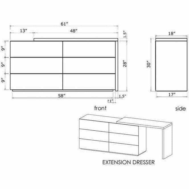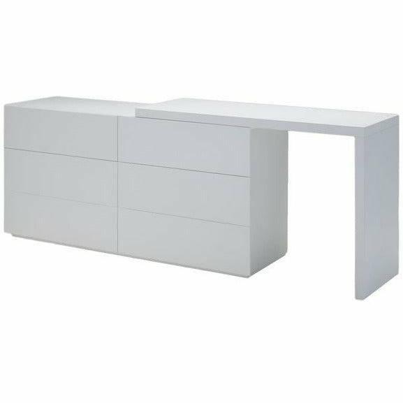 The VEX collection is a study of modern minimalism. It boasts a matte lacquer finish with mitered corner detailing. There is an absence of ornamental drawer hardware and in its place is a unique invisible side pull both functional and tactile. The surface is easily maintained and cleaned with soft-close drawer mechanisms and zero VOC construction. The extension dresser top is completely reversible and can be extended to your custom length running on a smooth felt glide. The pulldown door of the VEX chest opens to a fully extending shelf allowing easy display and access