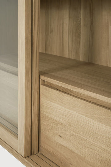 The Wave Cupboard merges modern aesthetics with functional elegance. The absence of handles paired with soft-closing doors and drawers adds to its refined look, while the tempered glass doors allow for easy display of your favorite pieces. Its solid oak construction and sleek design make this a timeless piece that adds warmth and sophistication to any room.