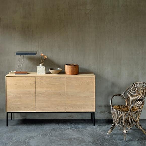 For the Whitebird collection, designer Alain van Havre masterfully blends opposing elements to create light and airy designs that stand out in any setting. The soft round legs contrast beautifully with the bold graphic lines, giving the sideboard a sleek yet approachable appearance. Made from solid oak with a varnish finish, this sideboard is a fine blend of natural elegance and modern functionality. Supported by sturdy black metal legs, the Whitebird sideboard is available in two configurations: one with three push-open doors and the other with two push-open doors and three drawers. This versatile piece offers ample storage space while effortlessly complementing a variety of interior styles.