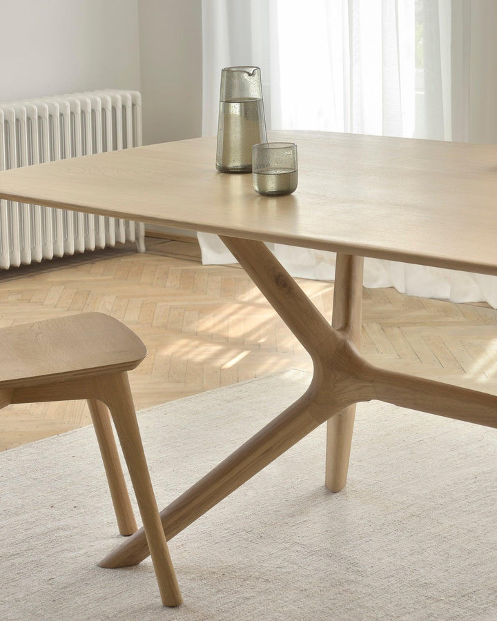 The X Dining Table, designed by the renowned Alain van Havre for Ethnicraft, exemplifies the beauty that lies in complexity refined into simplicity. This piece stands as a testament to advanced woodworking techniques, presenting a structure that is as sturdy as it is intricate. The unique interplay between the distinctively shaped legs and the softly contoured lines of the tabletop not only catches the eye but also ensures an exceptionally comfortable seating experience for guests. The X table is a bold expression of Alain van Havre's signature design ethos, making it a standout piece in any dining space.