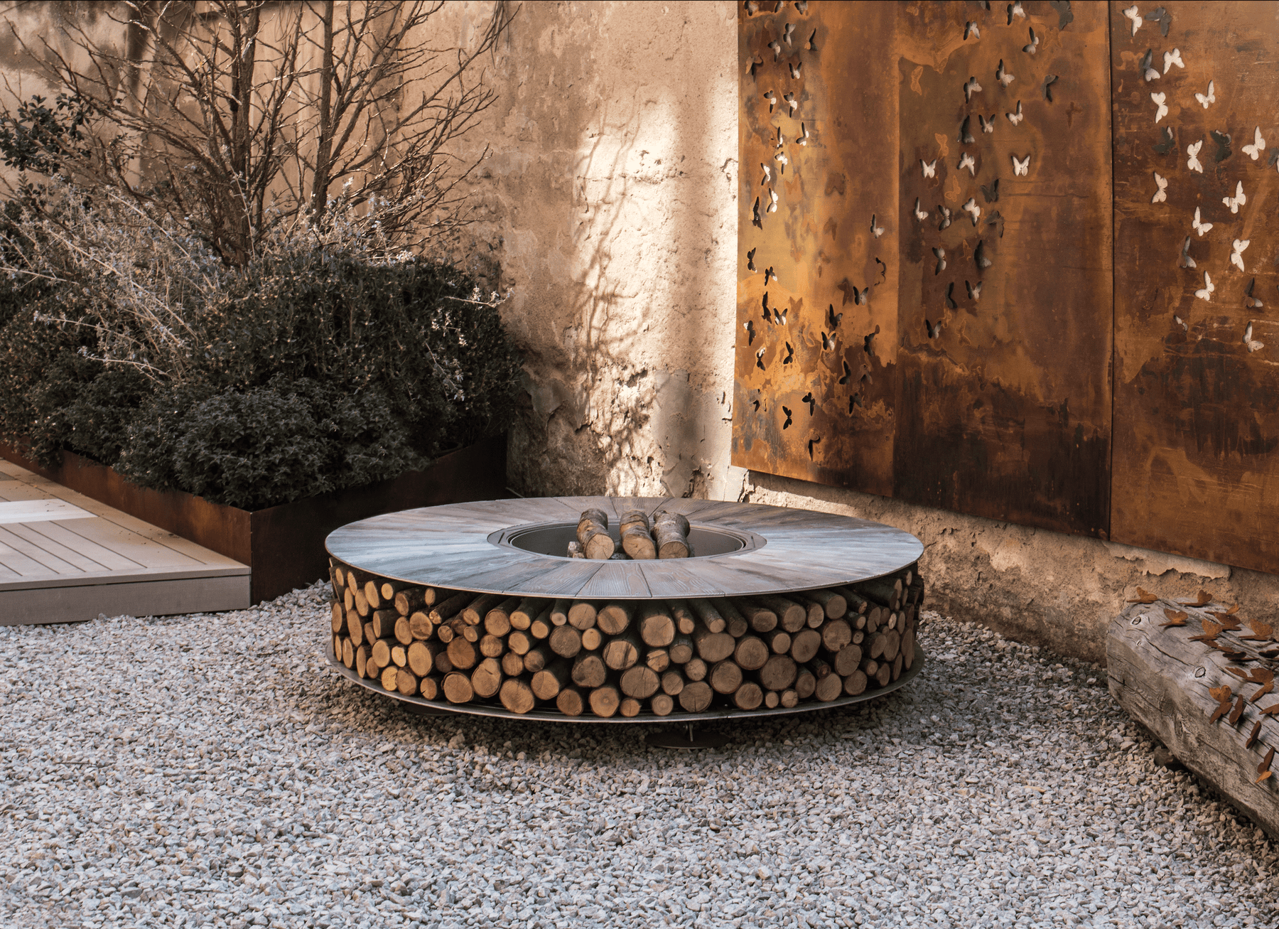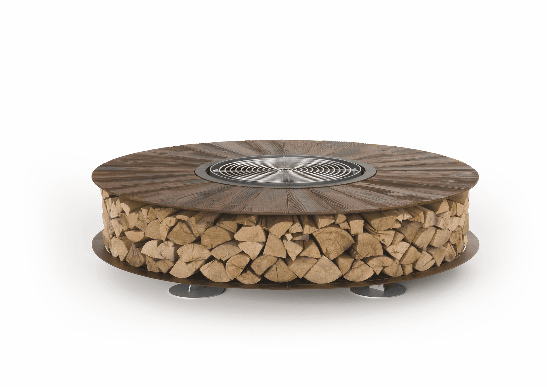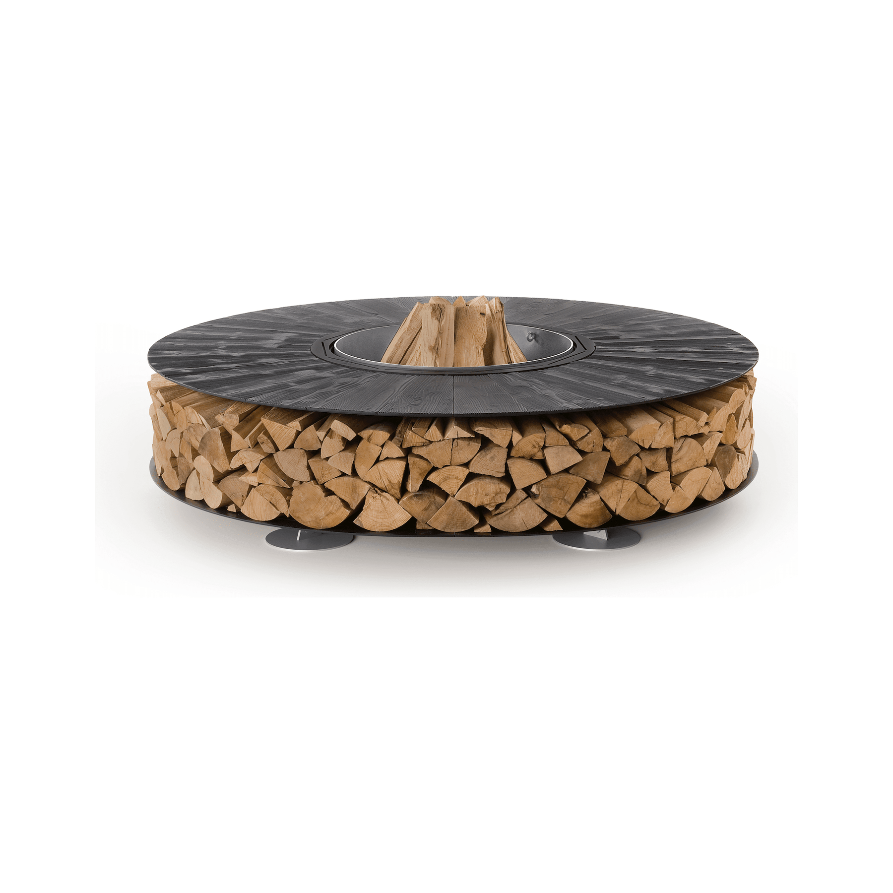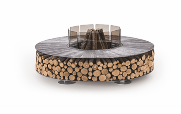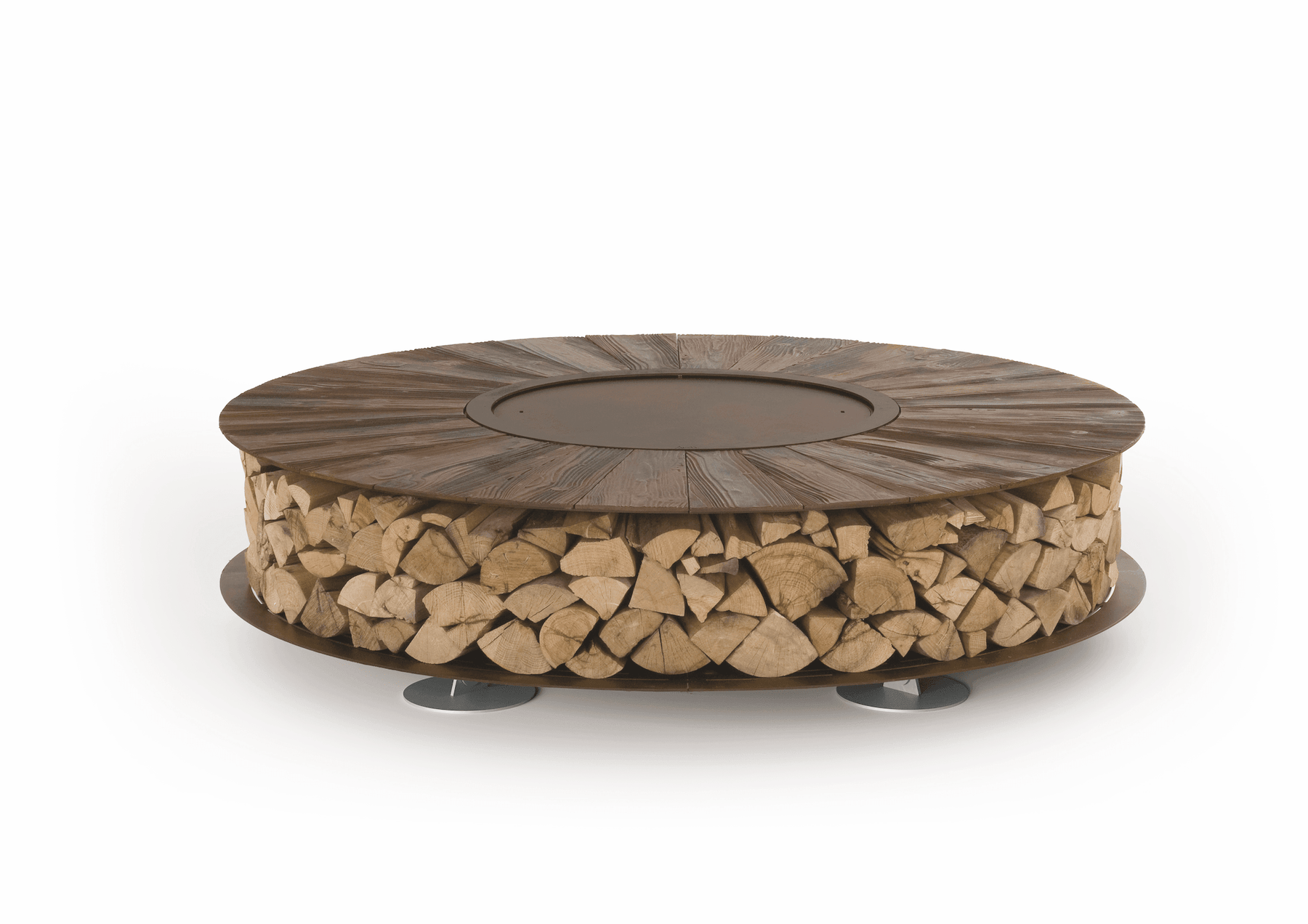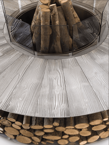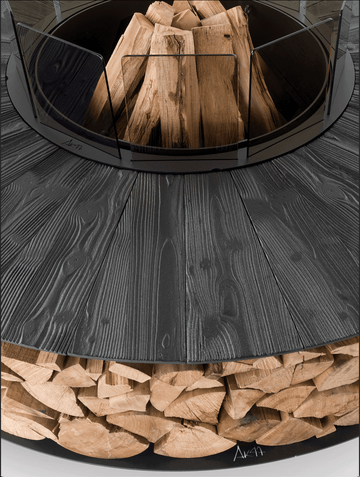 Introducing the ZERO Texture Wood Fire Pit by AK47 Design: It's more than a fire pit; it's a canvas where fire paints mesmerizing tales, weaving memories with every flicker and glow. Positioned amidst nature's tranquility or the opulence of outdoor patios, Zero stands as a magnetic core, drawing everyone closer. Gatherings around Zero become occasions marked by laughter, stories, and the enchanting dance of flames. From gardens to terraces and luxury hotel lounges, Zero defines space with contemporary elegance. Crafted from robust steel with an oxidized patina, it's resistant to corrosion. Galvanized steel feet ensure steadfastness against the elements. Every detail is meticulously addressed, from a cool-to-touch surface to a protective steel cover. For culinary enthusiasts, the optional stainless steel grill kit (sold separately) transforms Zero into a gourmet's delight, ready for outdoor cooking.