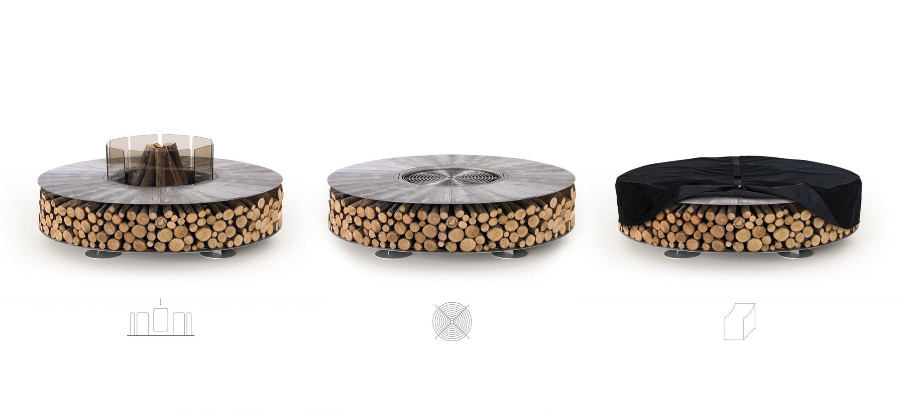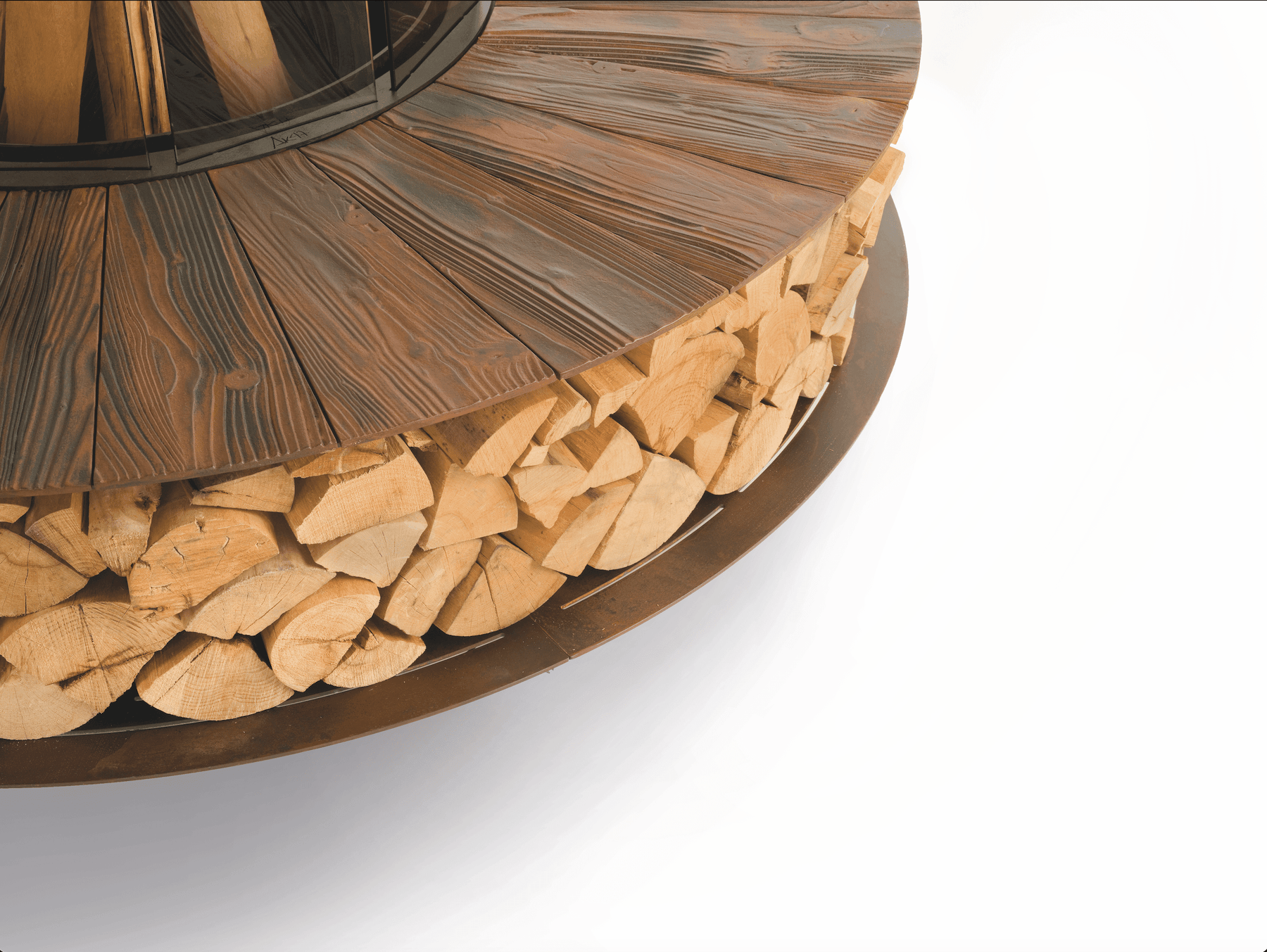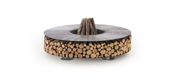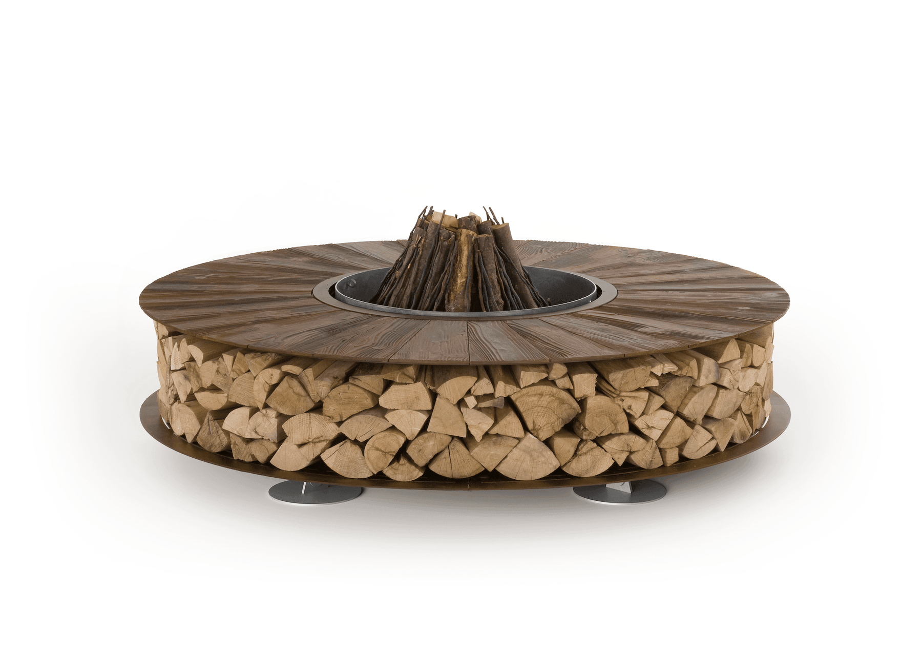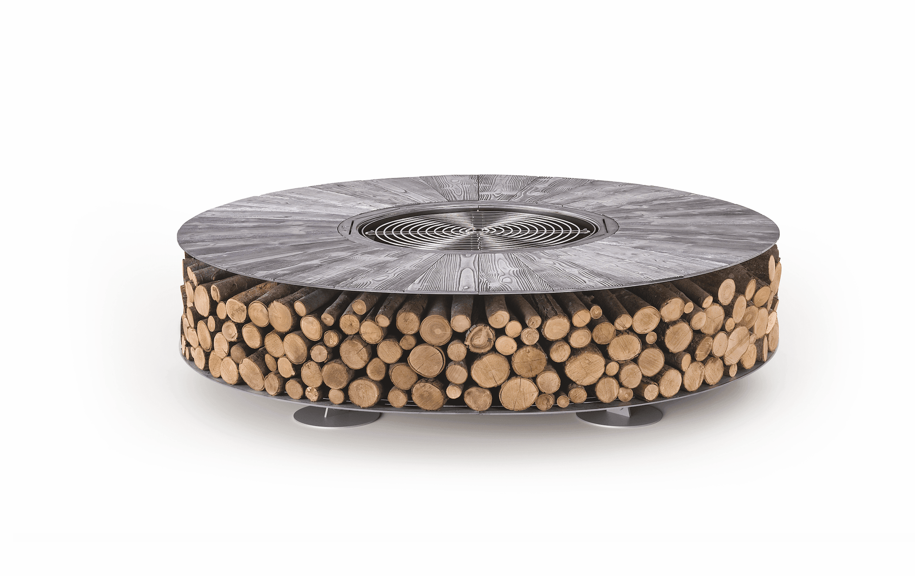 Introducing the ZERO Texture Wood Fire Pit by AK47 Design: It's more than a fire pit; it's a canvas where fire paints mesmerizing tales, weaving memories with every flicker and glow. Positioned amidst nature's tranquility or the opulence of outdoor patios, Zero stands as a magnetic core, drawing everyone closer. Gatherings around Zero become occasions marked by laughter, stories, and the enchanting dance of flames. From gardens to terraces and luxury hotel lounges, Zero defines space with contemporary elegance. Crafted from robust steel with an oxidized patina, it's resistant to corrosion. Galvanized steel feet ensure steadfastness against the elements. Every detail is meticulously addressed, from a cool-to-touch surface to a protective steel cover. For culinary enthusiasts, the optional stainless steel grill kit (sold separately) transforms Zero into a gourmet's delight, ready for outdoor cooking.