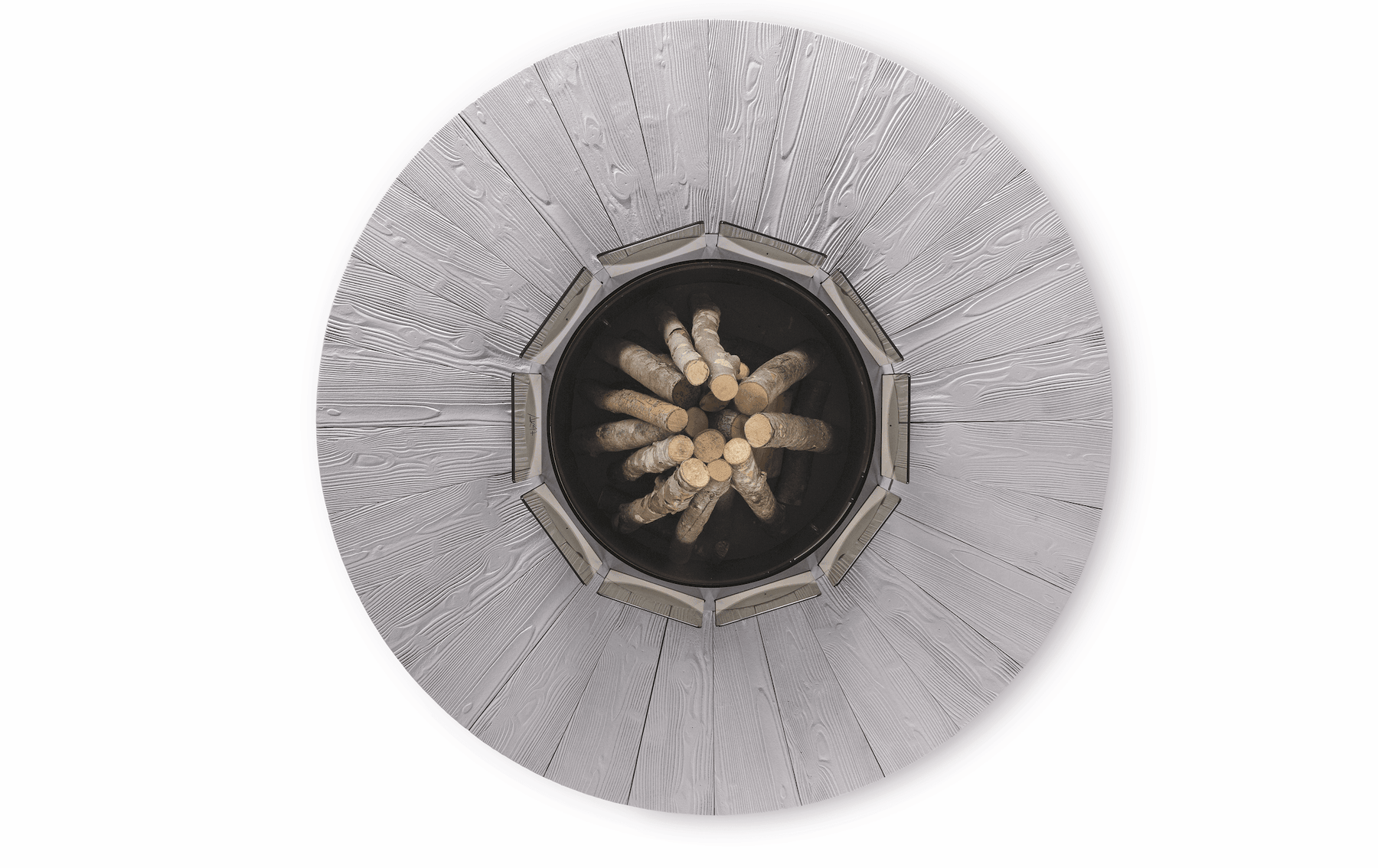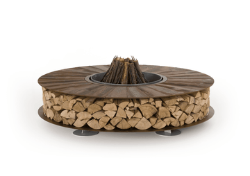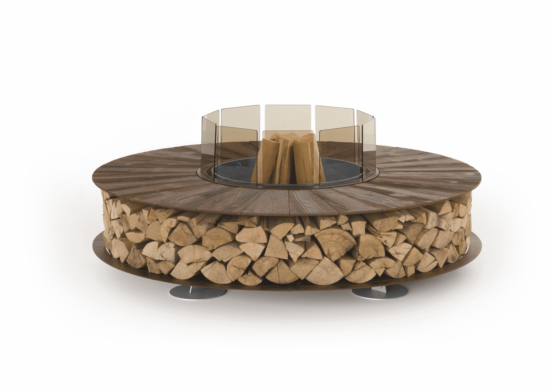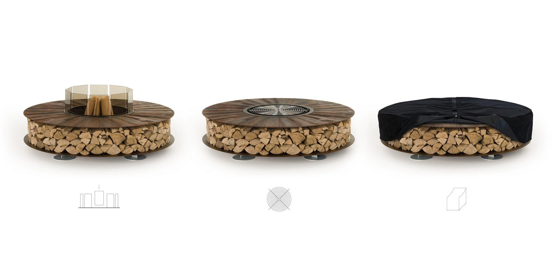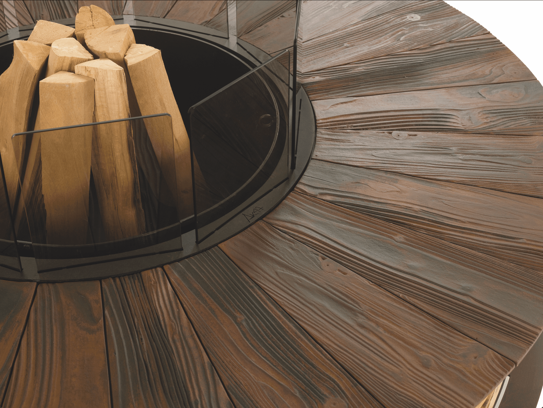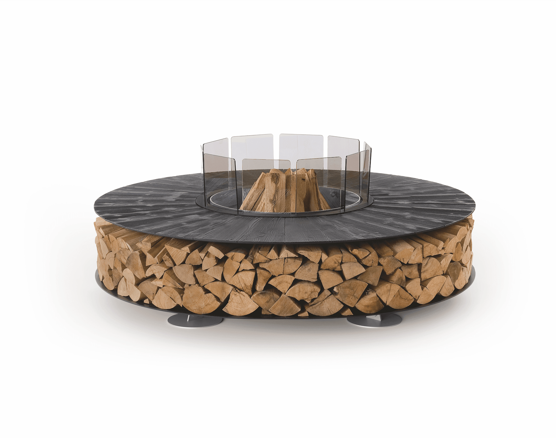 Introducing the ZERO Texture Wood Fire Pit by AK47 Design: It's more than a fire pit; it's a canvas where fire paints mesmerizing tales, weaving memories with every flicker and glow. Positioned amidst nature's tranquility or the opulence of outdoor patios, Zero stands as a magnetic core, drawing everyone closer. Gatherings around Zero become occasions marked by laughter, stories, and the enchanting dance of flames. From gardens to terraces and luxury hotel lounges, Zero defines space with contemporary elegance. Crafted from robust steel with an oxidized patina, it's resistant to corrosion. Galvanized steel feet ensure steadfastness against the elements. Every detail is meticulously addressed, from a cool-to-touch surface to a protective steel cover. For culinary enthusiasts, the optional stainless steel grill kit (sold separately) transforms Zero into a gourmet's delight, ready for outdoor cooking.